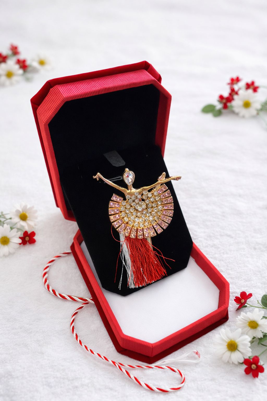 Brosa balerina aurie cu strasuri albe si rosii, martisor, cutie catifea 9x8x2.5 cm
