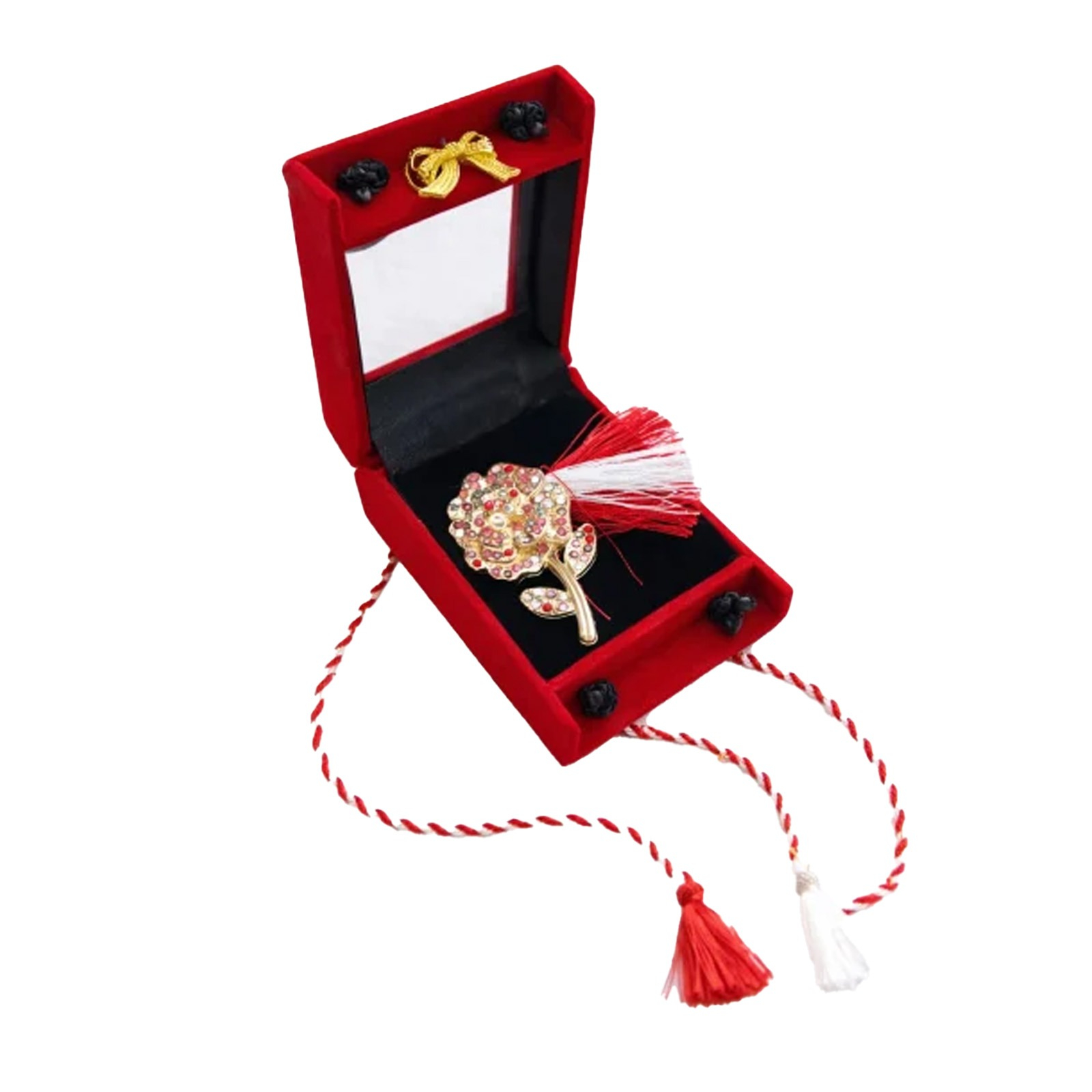 Brosa Trandafir Martisor cu Strasuri si Perla in Cutie de Catifea