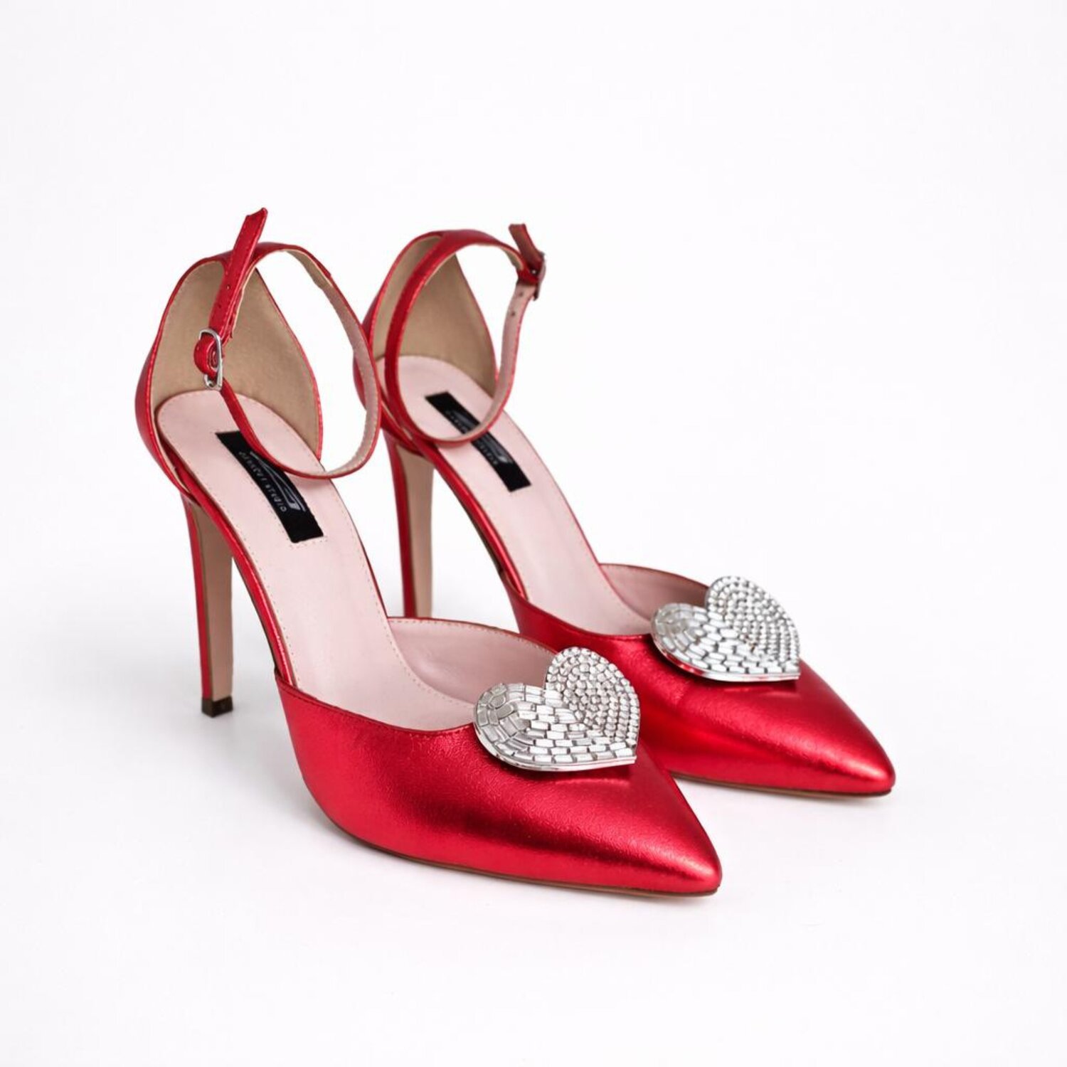Pantofi stiletto trend piele roz pudra cu aplicatii florale