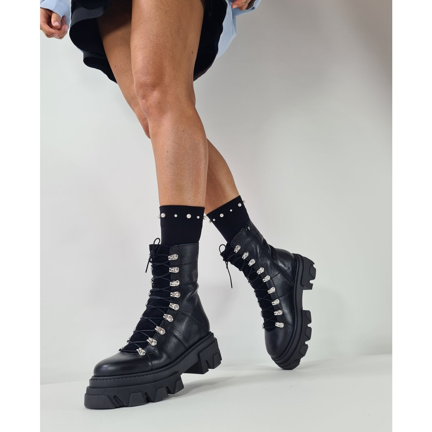 Ghete dama Piele Naturala Negre cu accesorii argintii Ivanna