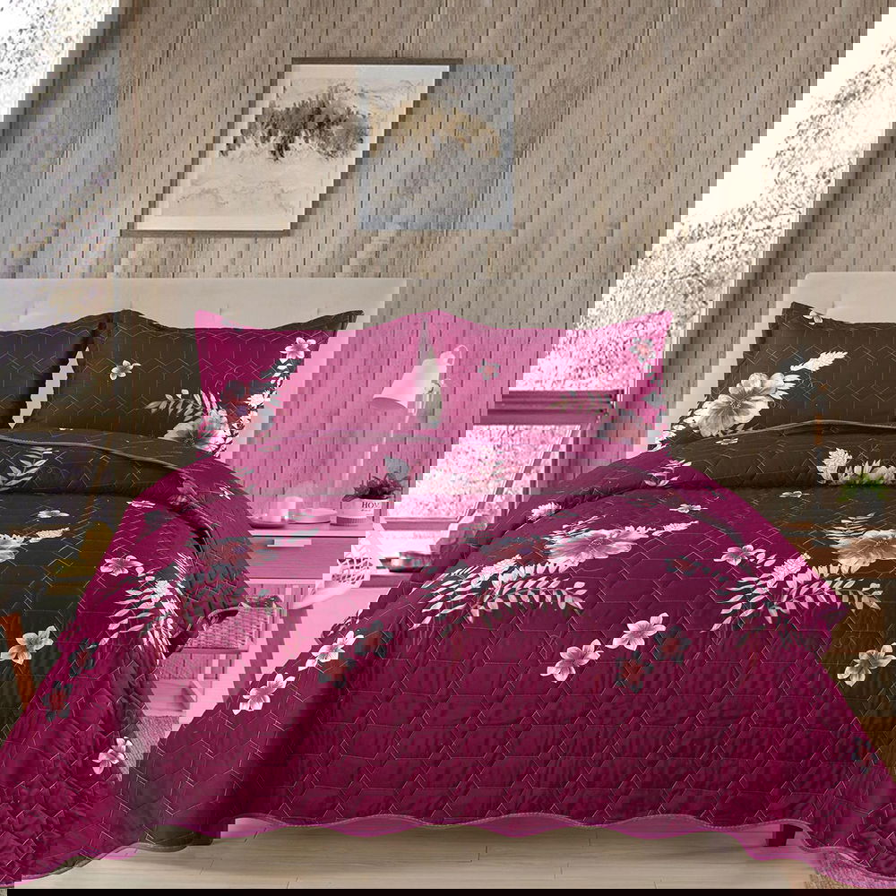 Set 3 Piese Cuvertura de Pat din Bumbac Satinat + 2 Fete de Perna 54x75 cm - Bordo cu Flori - CVBS_M127B