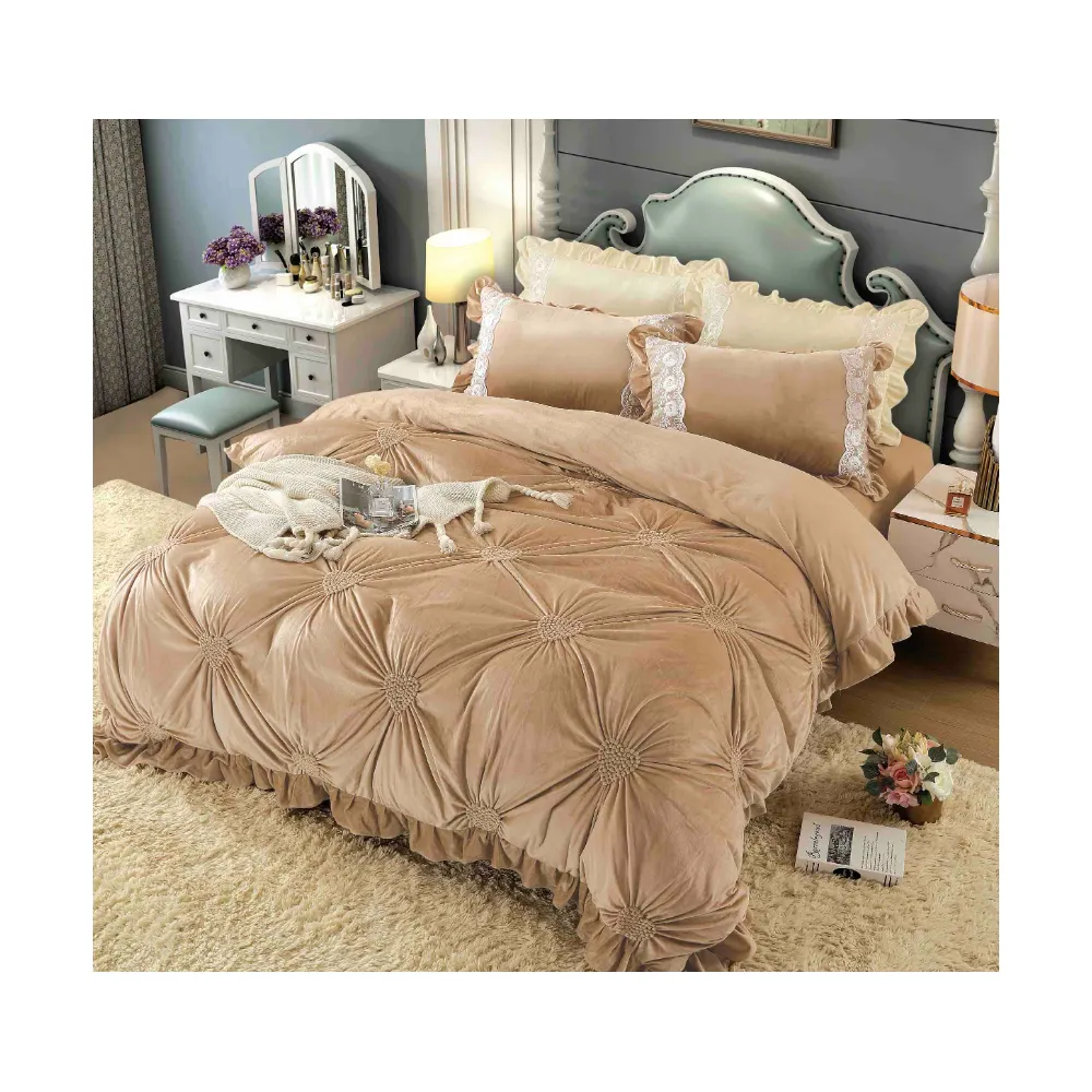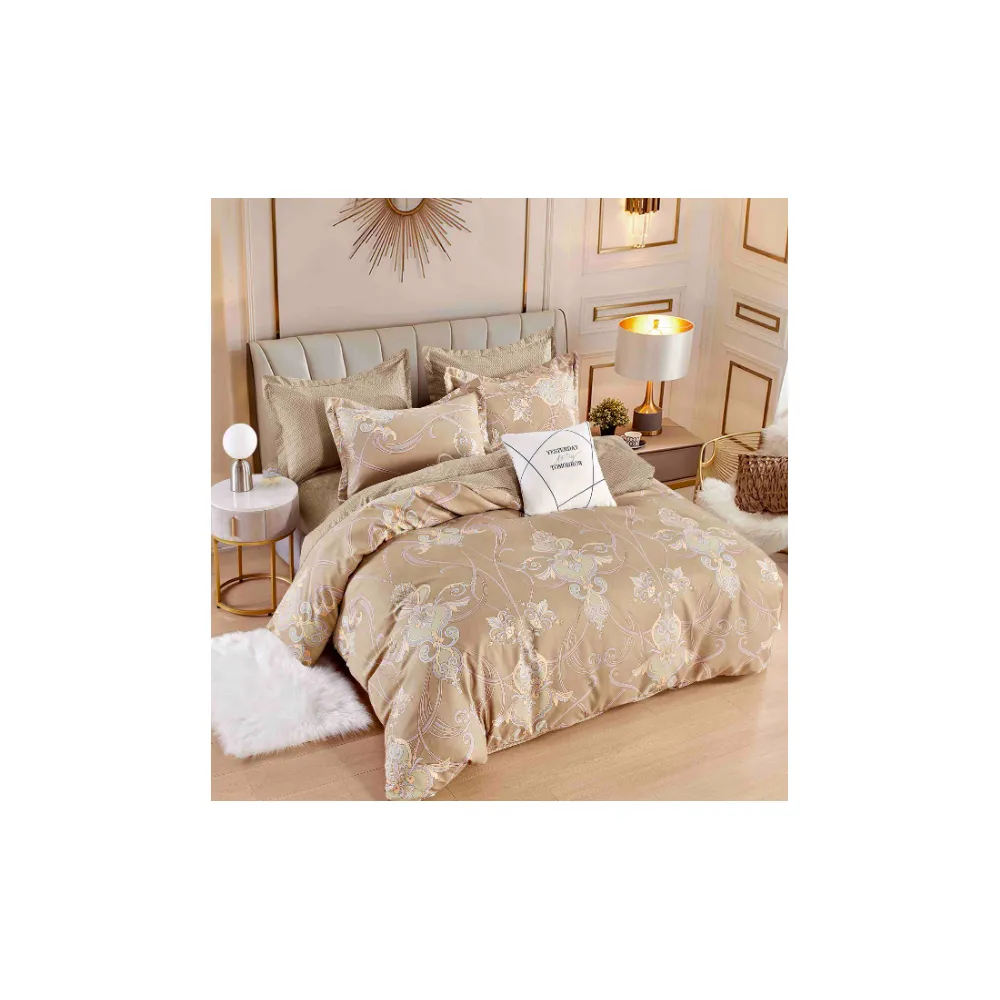 Lenjerie de Pat, din Catifea cu Broderie pentru Pat Dublu, 4 Piese, Maro Deschis - JOJ193