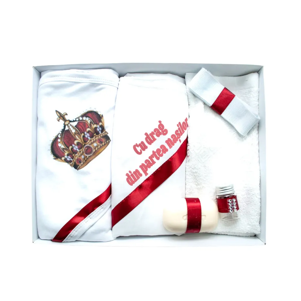 Trusou Botez, 6 Piese cu Text Imprimat Cu drag din partea nasilor, Rosu, Coroana - TB170