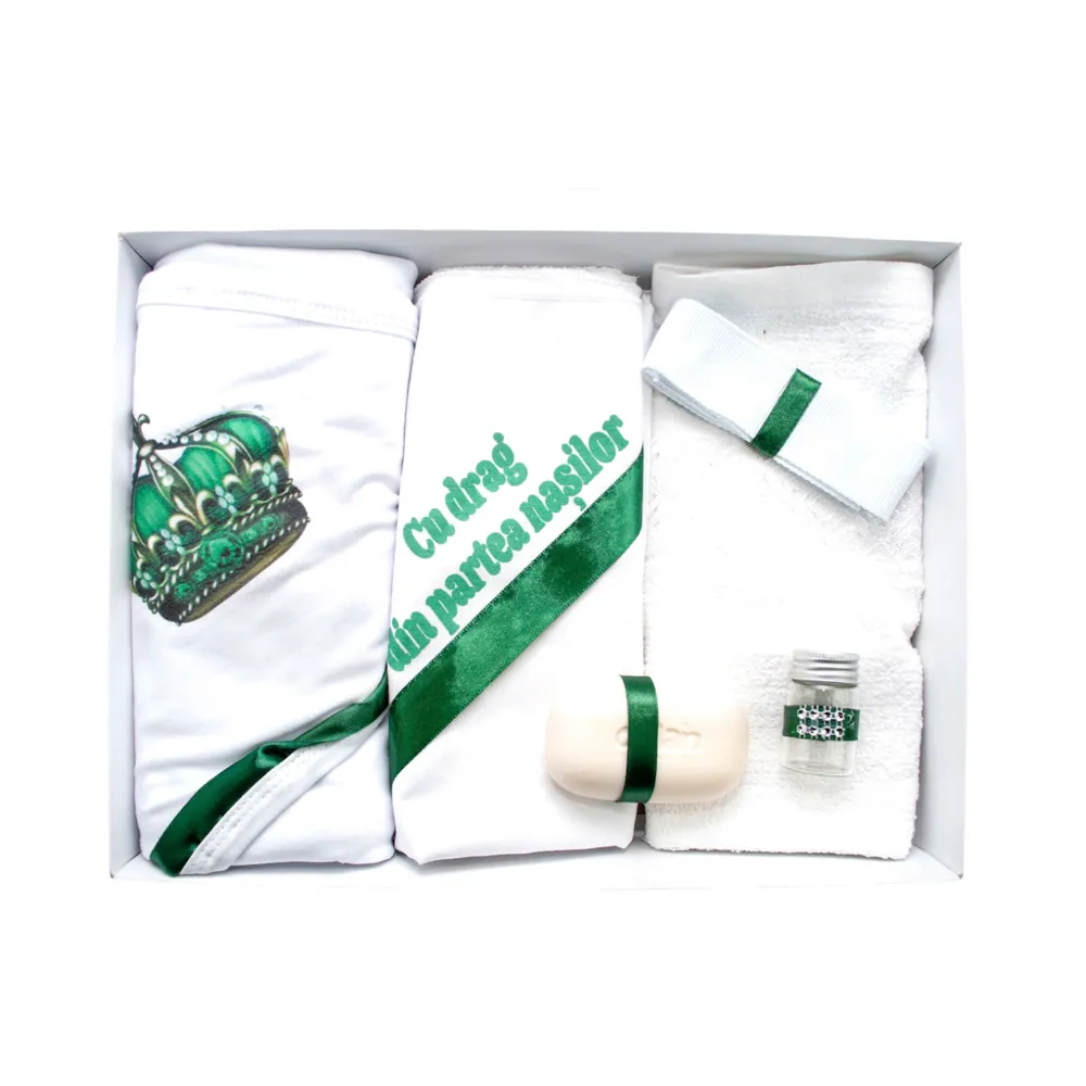 Trusou Botez, 6 Piese cu Text Imprimat Cu drag din partea nasilor, Verde, Coroana - TB169