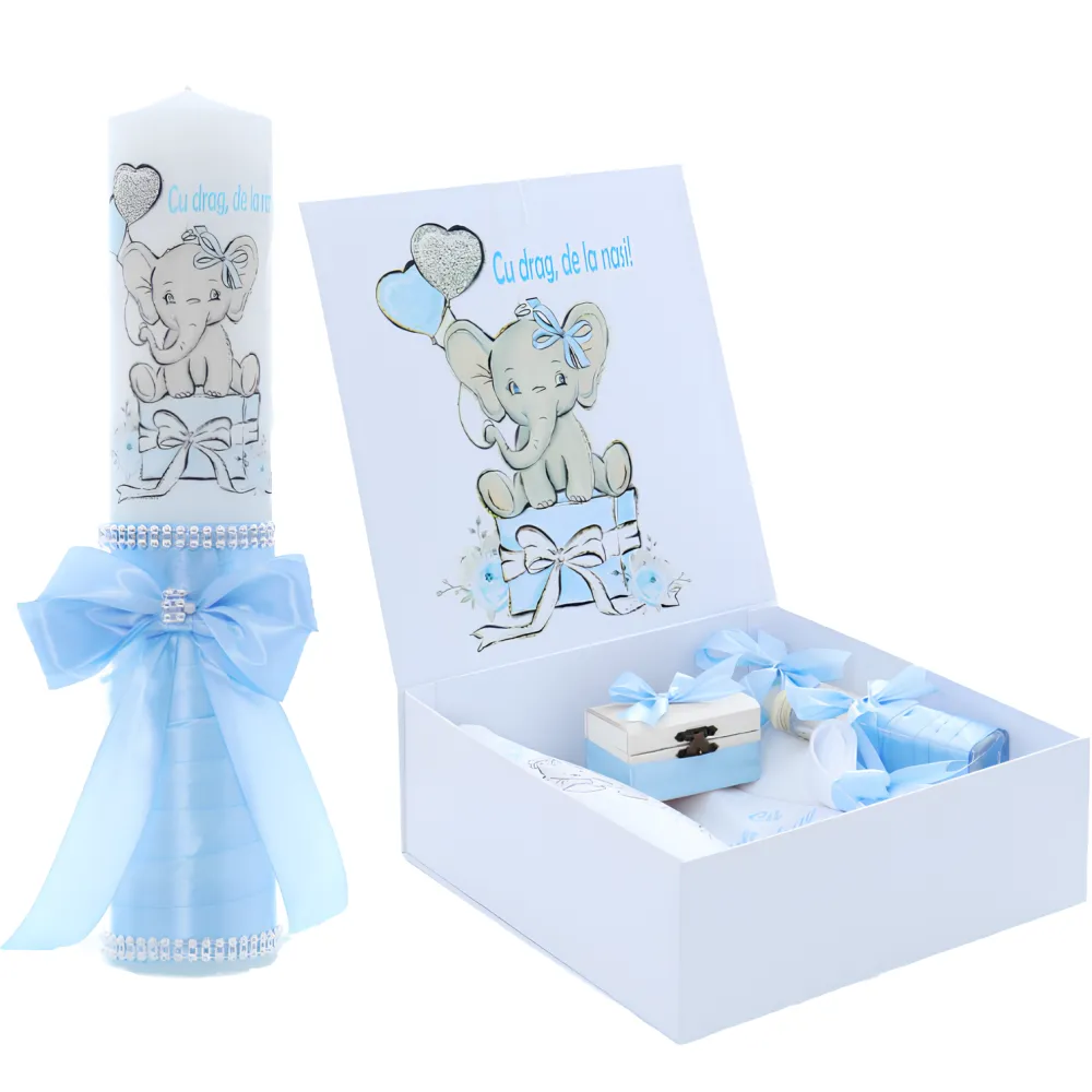 Set Cutie Trusou cu Lumanare, 9 Piese, Cu drag de la nasi, Bleu, Elefant - TB195