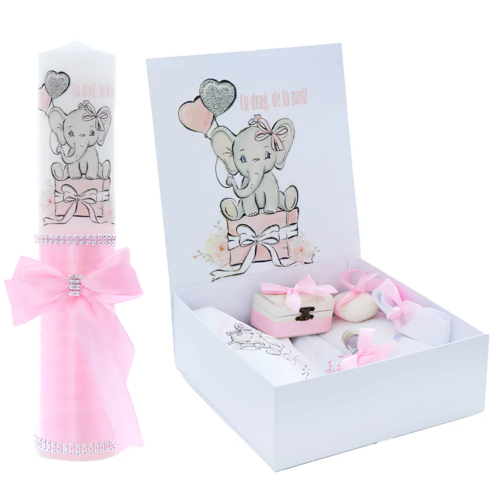 Set Cutie Trusou cu Lumanare, 9 Piese, Cu drag de la nasi, Roz Deschis, Elefant - TB182