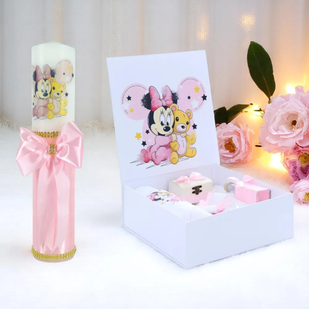 Set Cutie Trusou cu Lumanare, 9 Piese, Cu drag de la nasi, Roz Pudra, Minnie Mouse - TB190