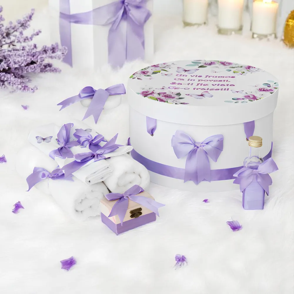 Trusou Botez cu 8 Piese Imprimat, Poezie, Culoare Violet - TB210