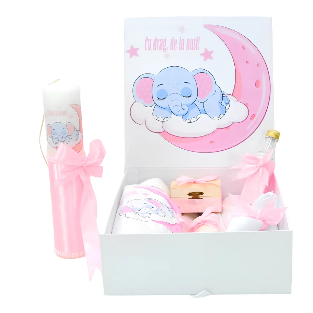 Set Cutie Trusou cu Lumanare, 9 Piese Cu drag de la nasi - Luna Elefant, Roz - TB226