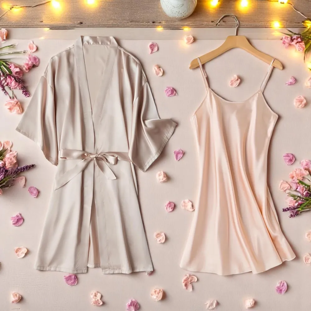 Compleu 2 Piese Dama, Halat si Cămașă de Noapte din Satin, Culoare Roz Pudra - MEI37