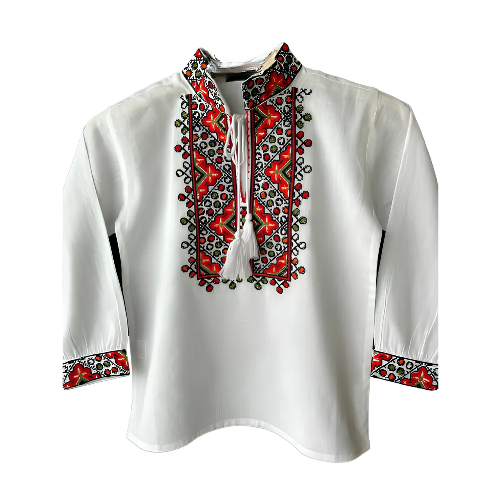 Camasa Traditionala de Baieti Alba cu Motiv Floral Rosu - ITB29