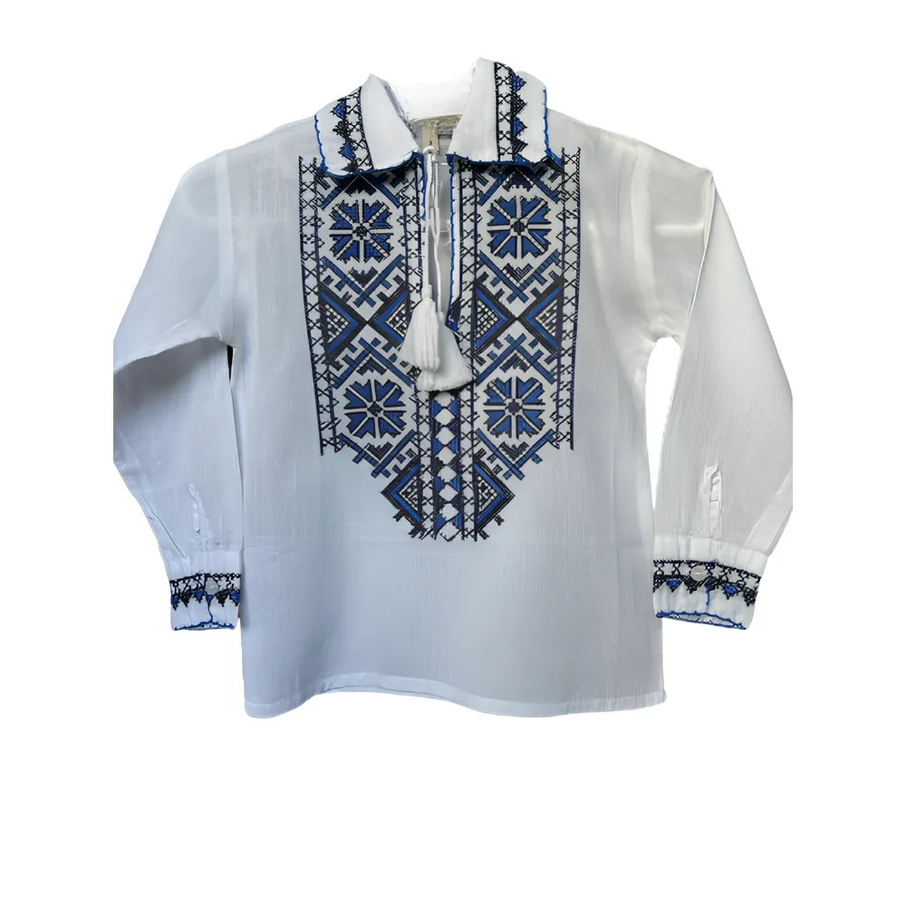 Camasa Traditionala de Baieti Alba cu Motiv Geometric Albastru - ITB36