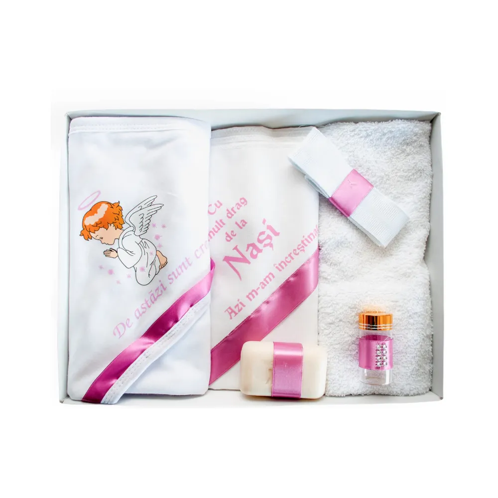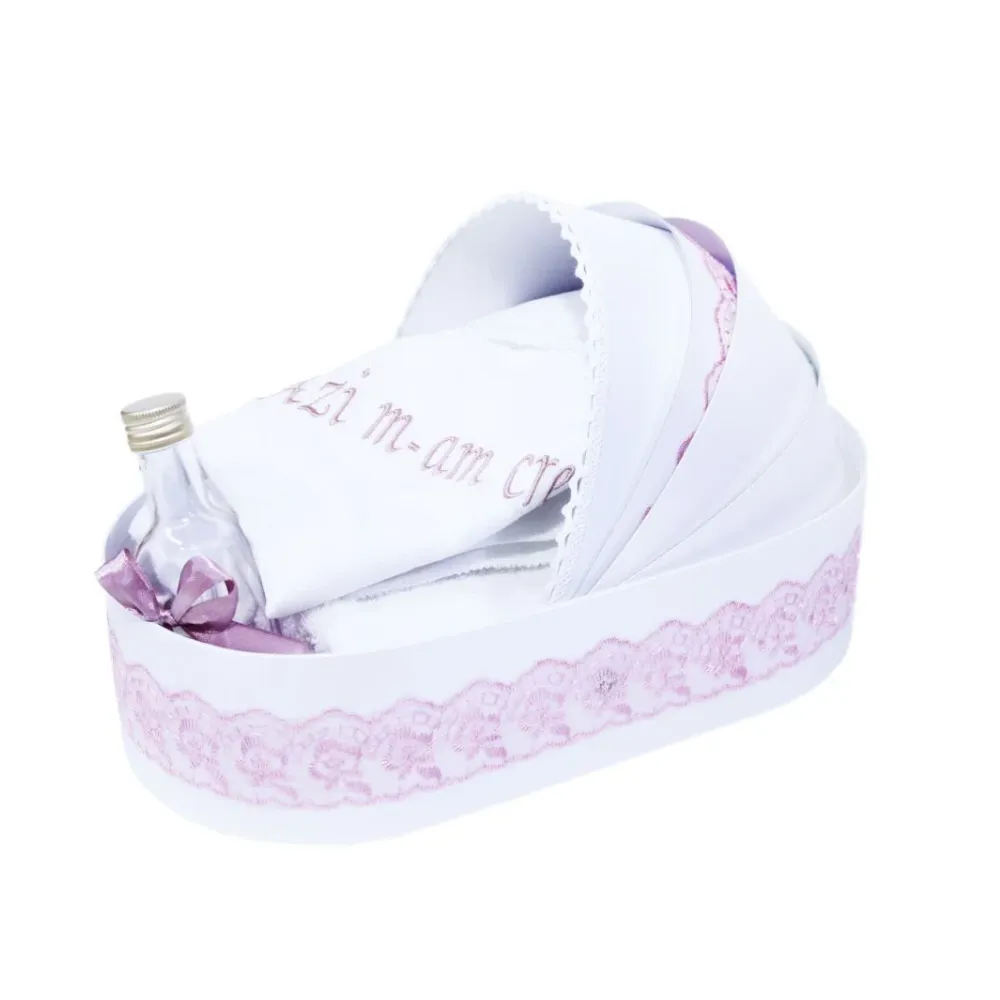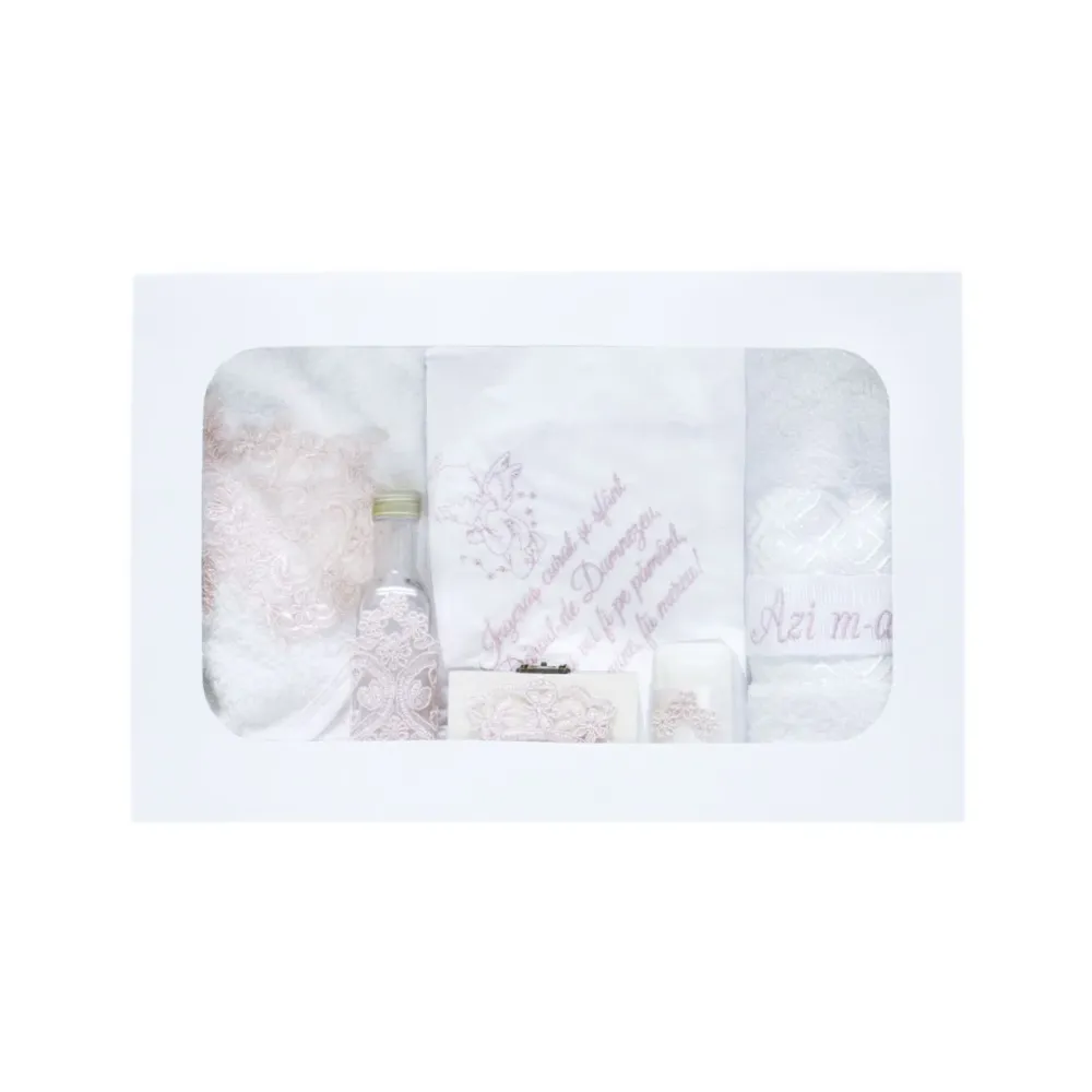 Trusou botez cu 7 piese personalizat cu broderie - Azi m-am botezat - ALB- ROZ - TB57