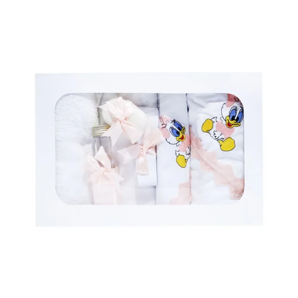 Trusou Botez cu 7 piese - Daisy Duck brodata - ALB - ROZ DESCHIS - TB79