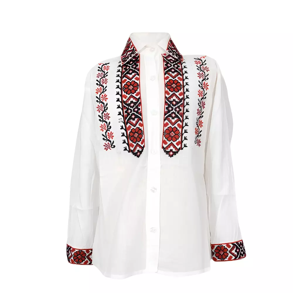 Camasa Traditionala de Baieti Alba cu Motiv Geometric Rosu - ITB42