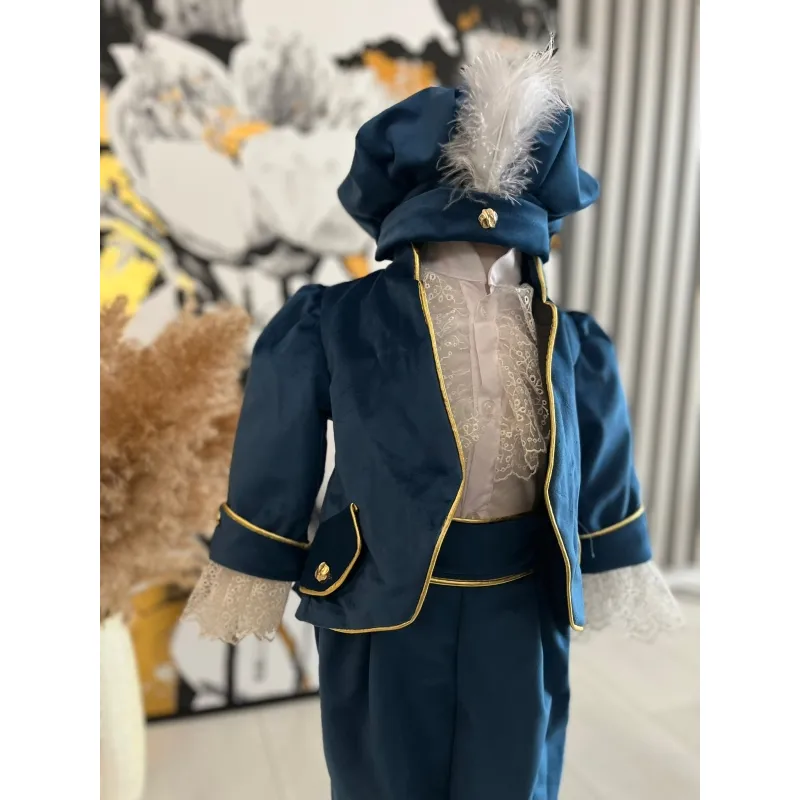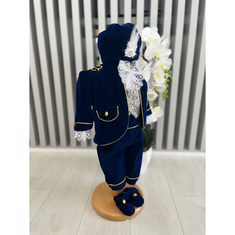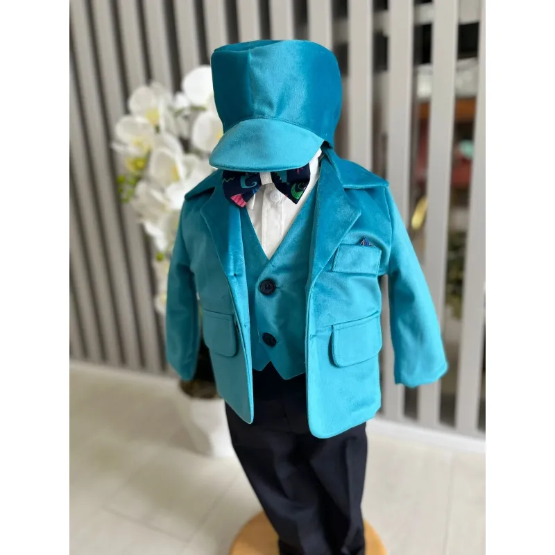 Costum botez 5 piese catifea, azuriu - DPH362
