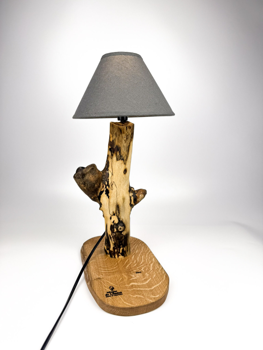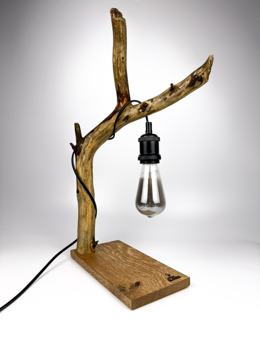 Lampa decorativa de birou handmade din stejar, ramura naturala, baza din stejar