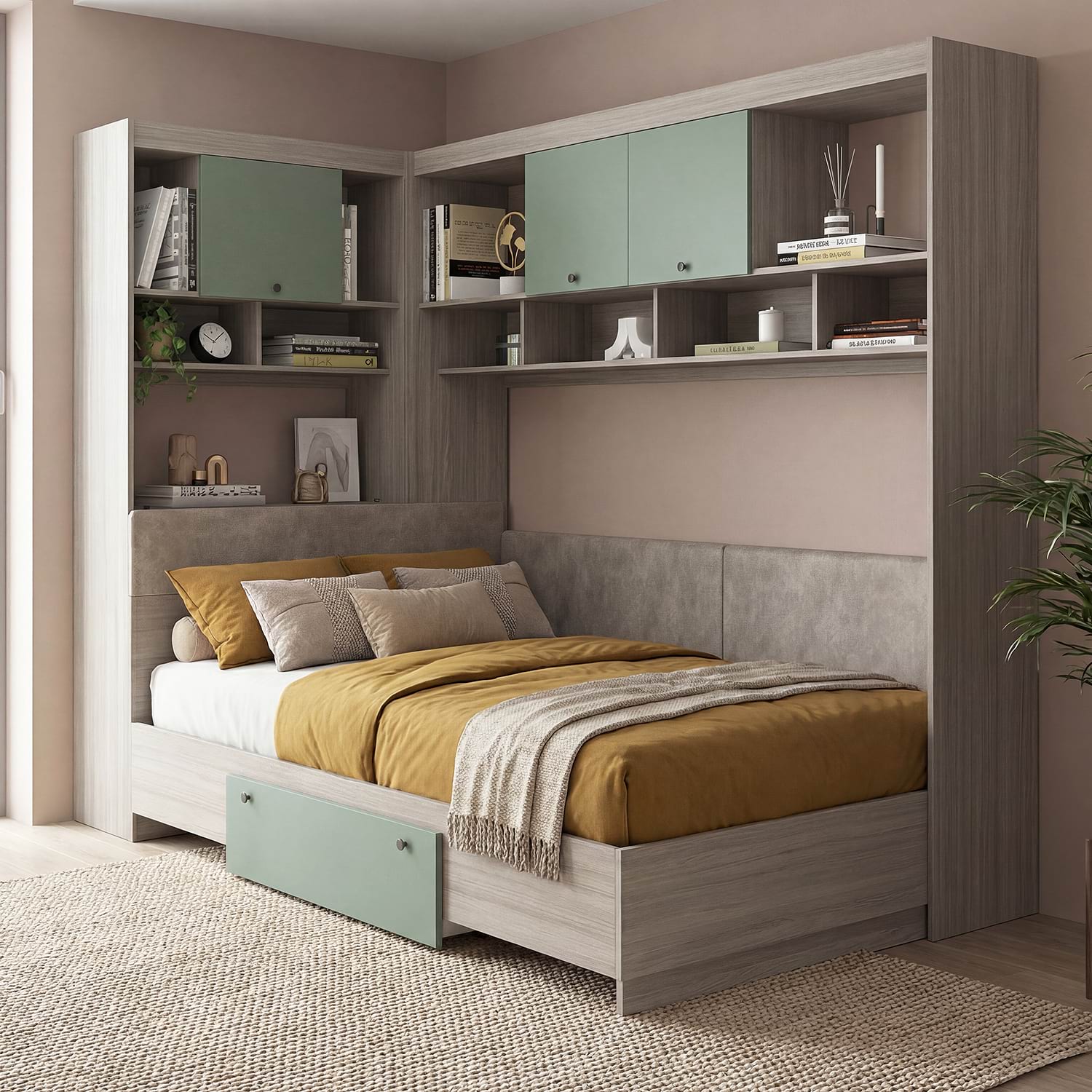Dormitor tineret colt ALESSIO 3, tablie pat tapitata, Oak, Verde Eucalipt
