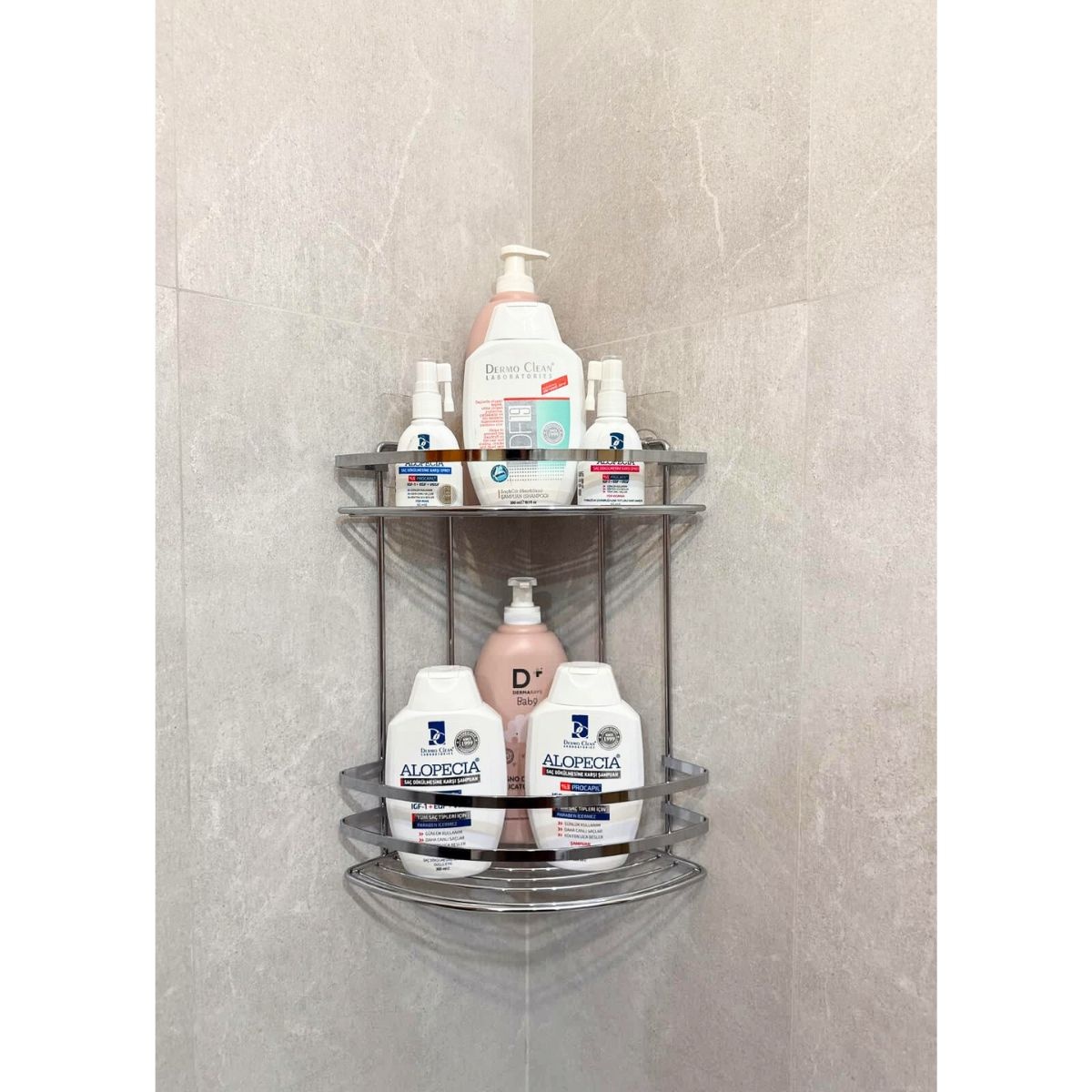 Etajeră colț baie fără găurire, cu 2 niveluri și prindere prin lipire