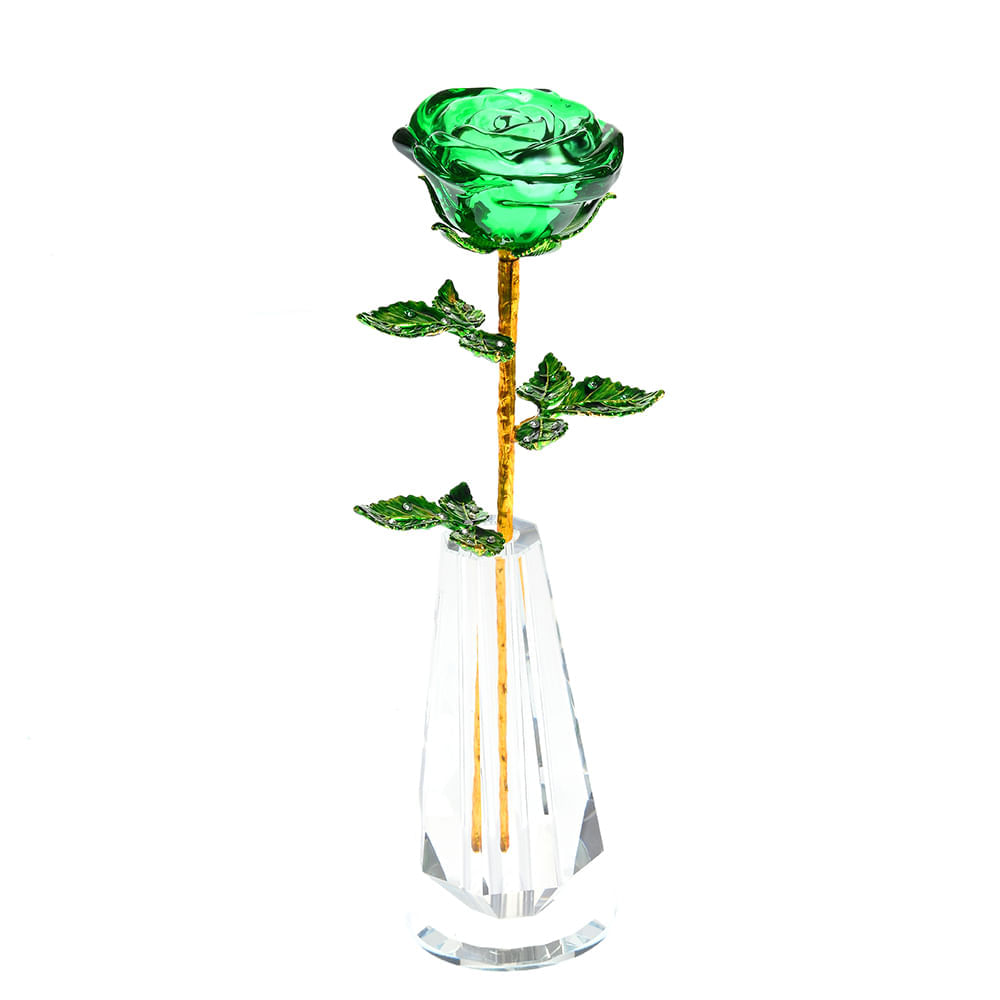 Trandafir decorativ verde din cristal cu suport transparent 26 cm
