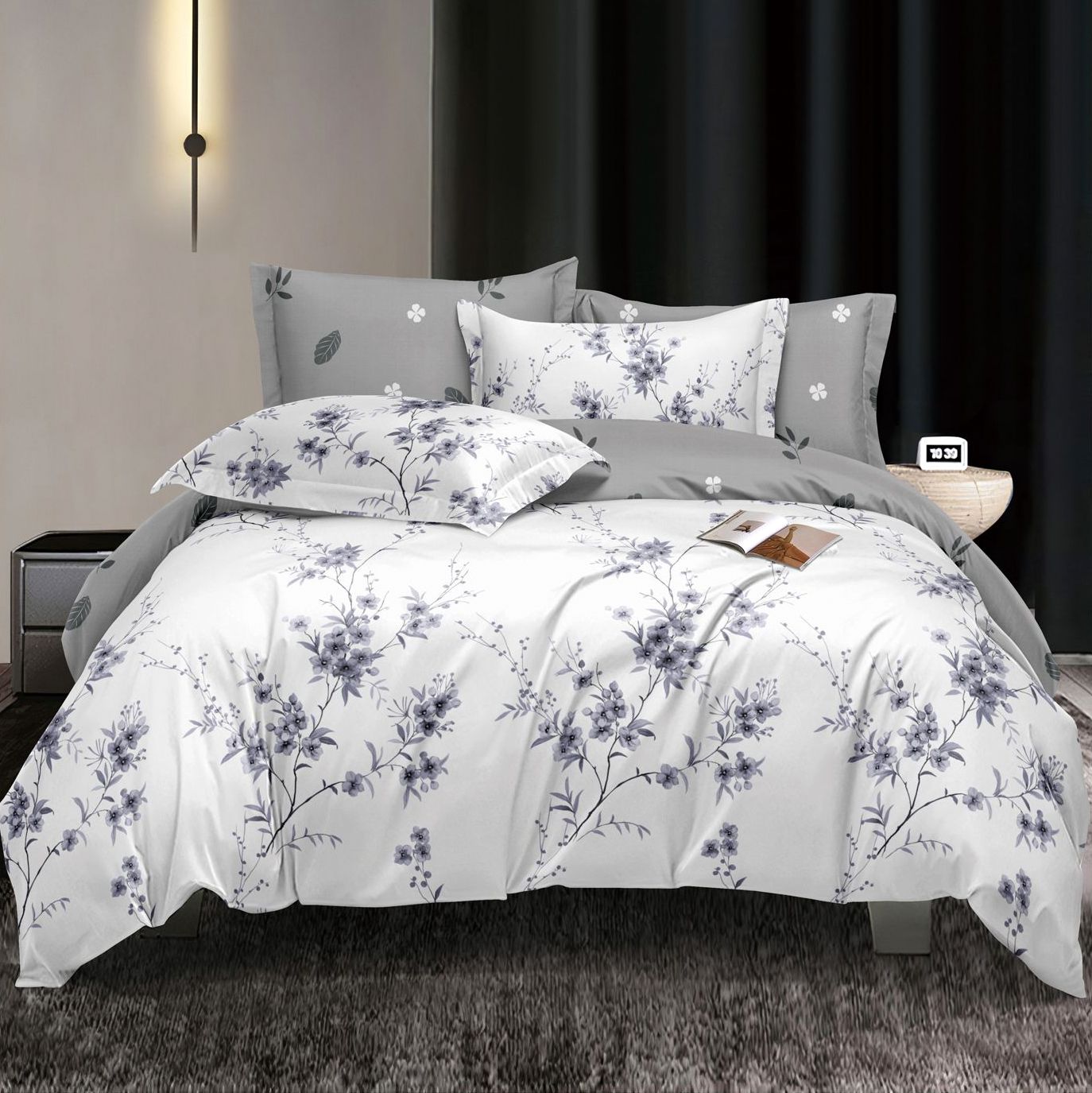 (OFERTA 3 la 199 Lei) Lenjerie pat dublu cu doua feţe, bumbac satinat, 4 piese, Gri, flori