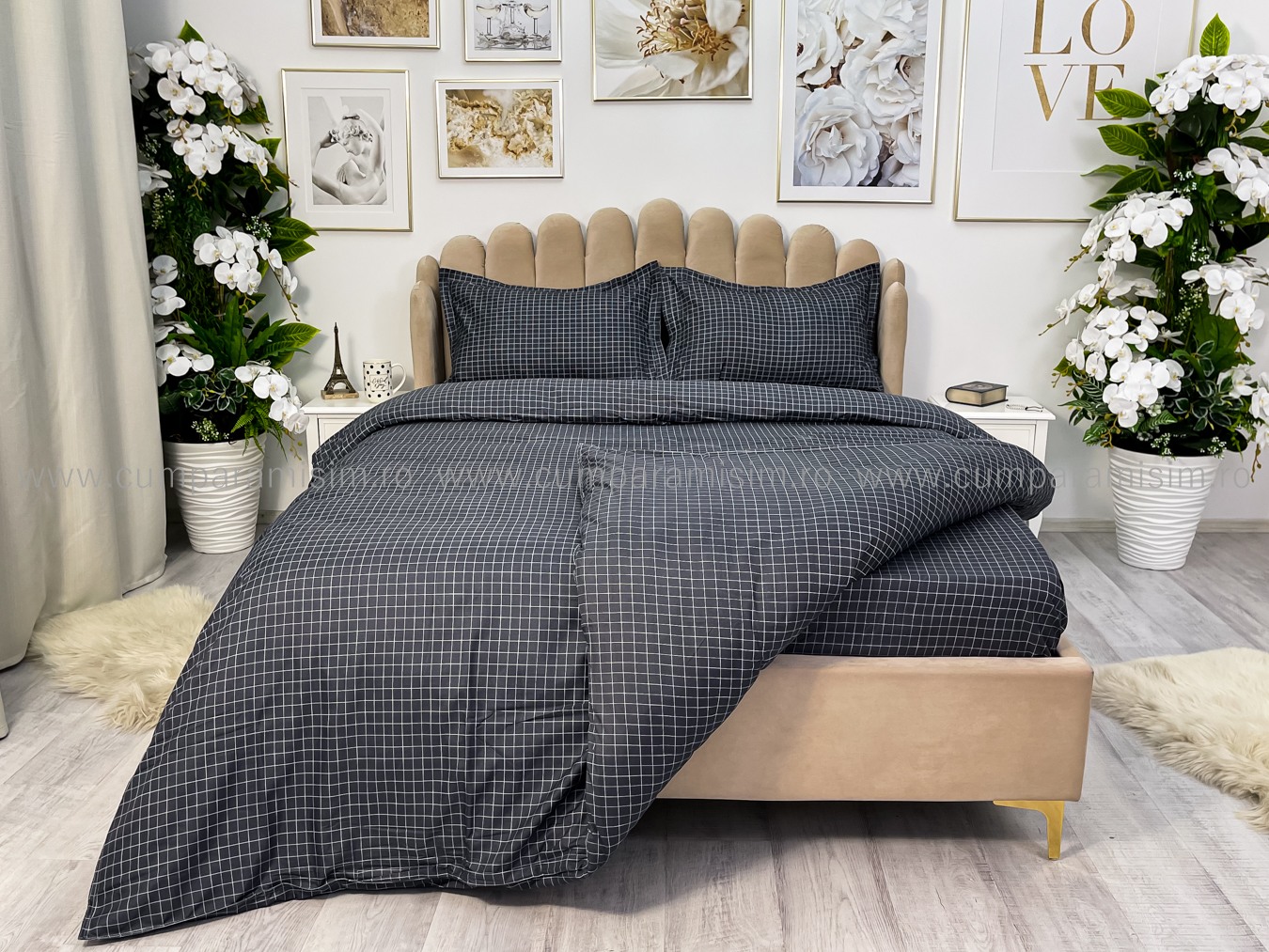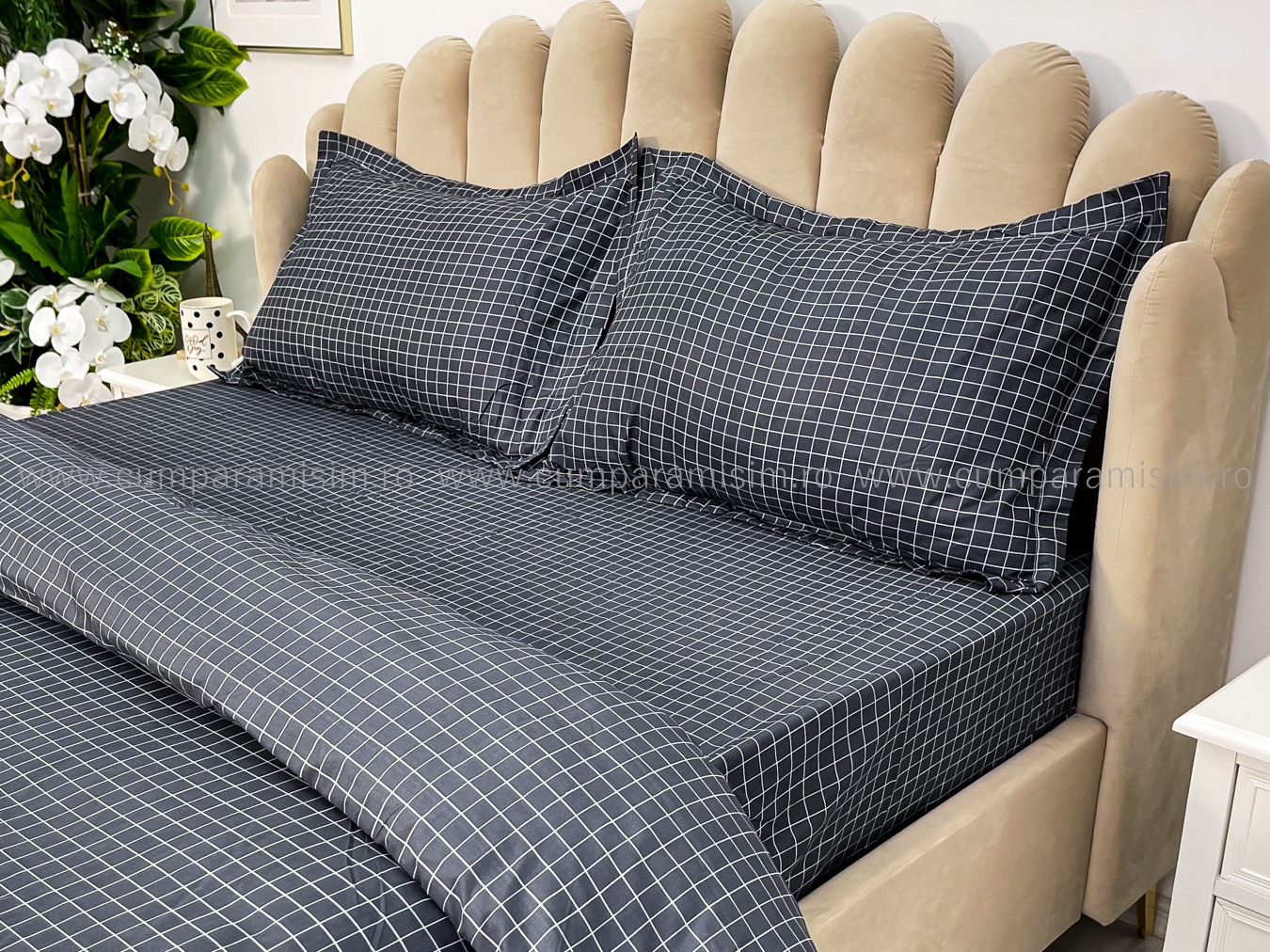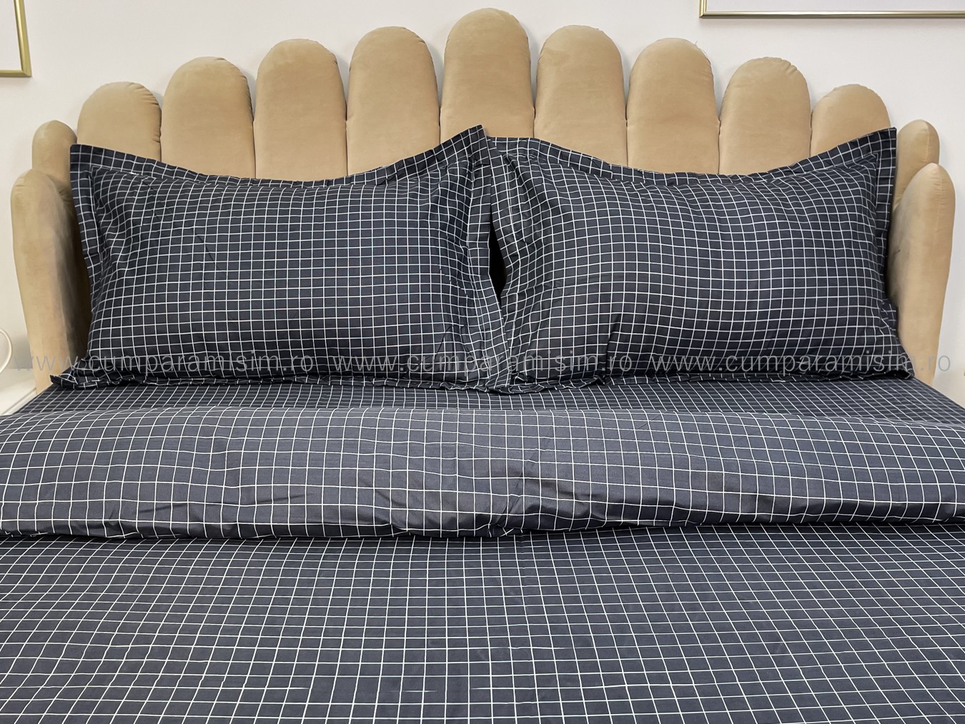 (OFERTA 3 la 199 Lei) Lenjerie pat dublu cu doua feţe, bumbac satinat, 4 piese, Gri inchis, carouri
