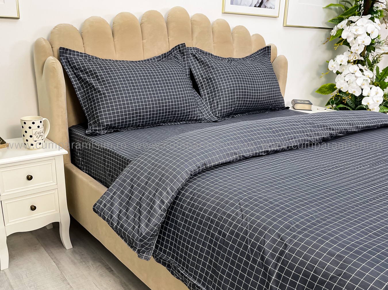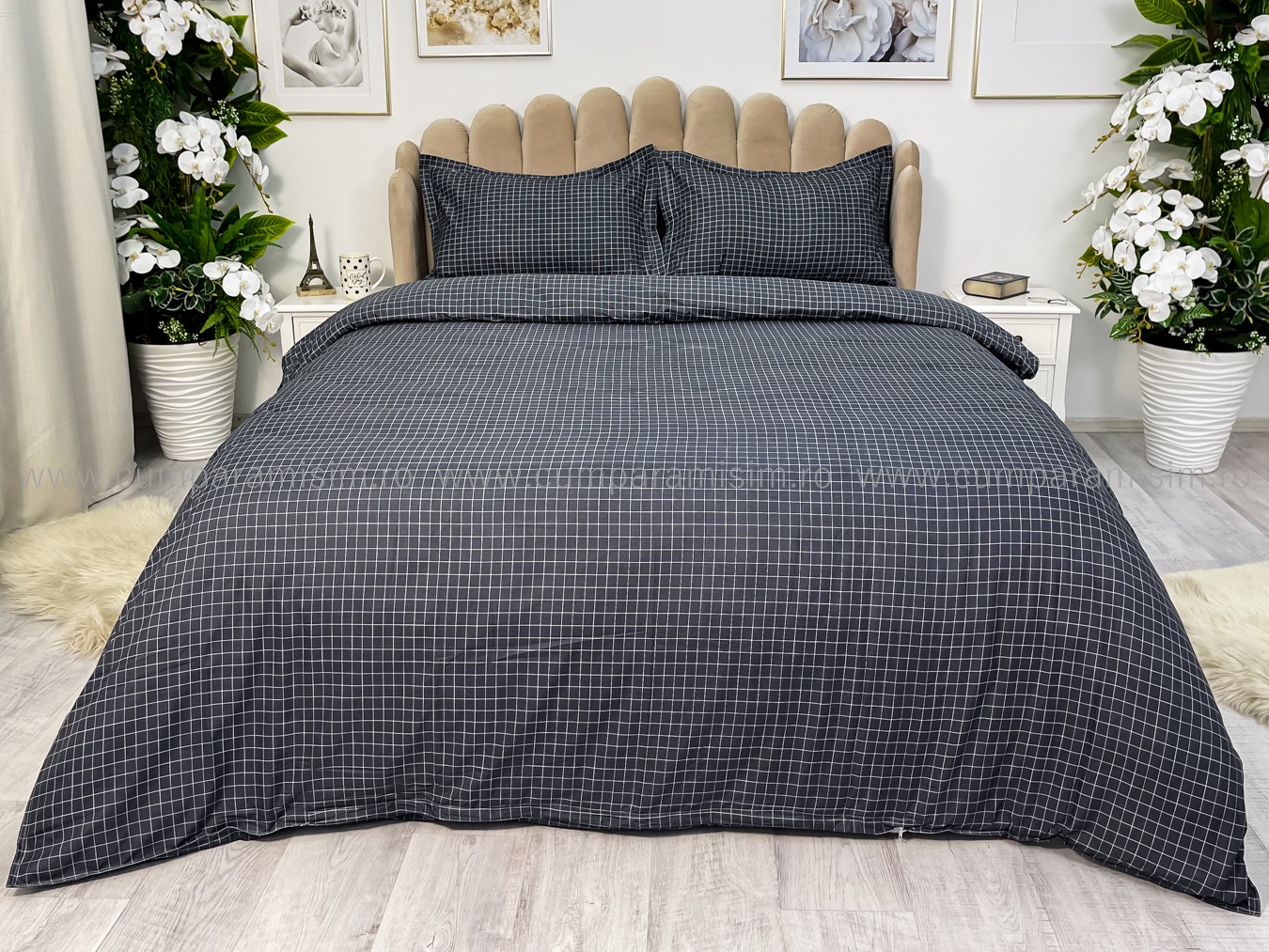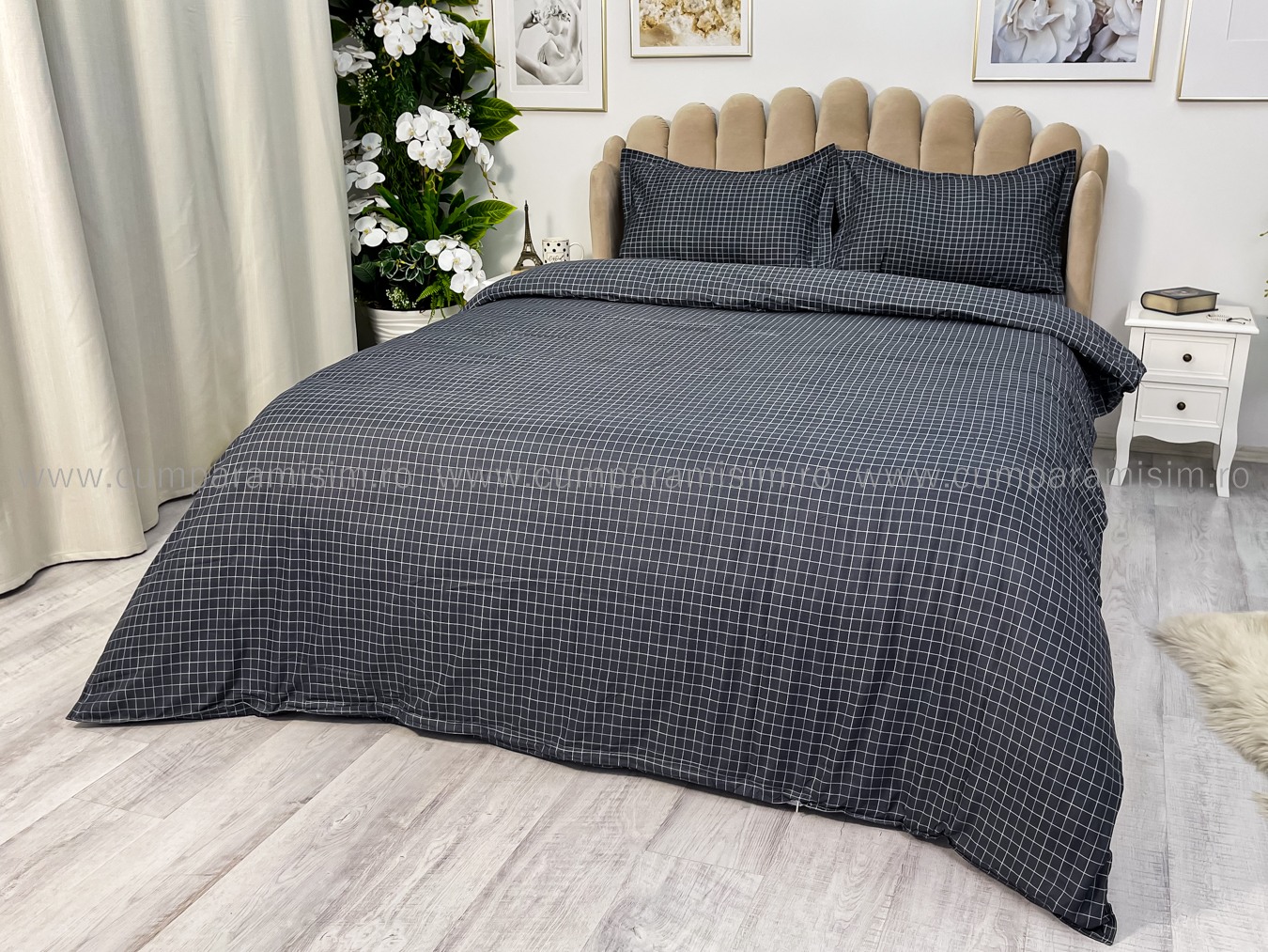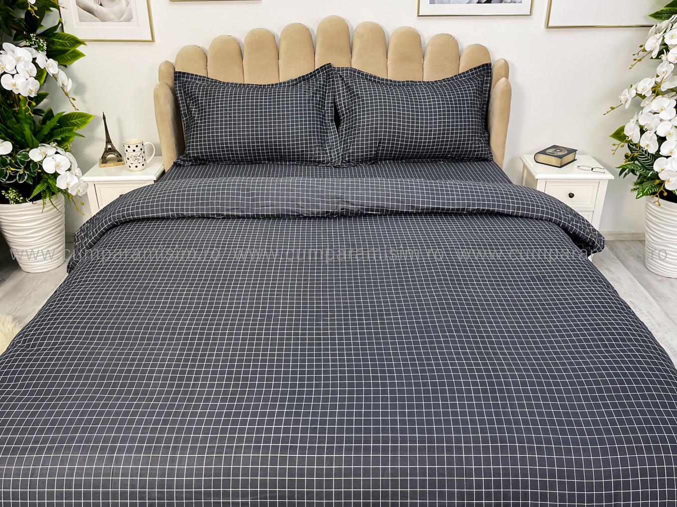 (OFERTA 3 la 199 Lei) Lenjerie pat dublu cu doua feţe, bumbac satinat, 4 piese, Gri inchis, carouri
