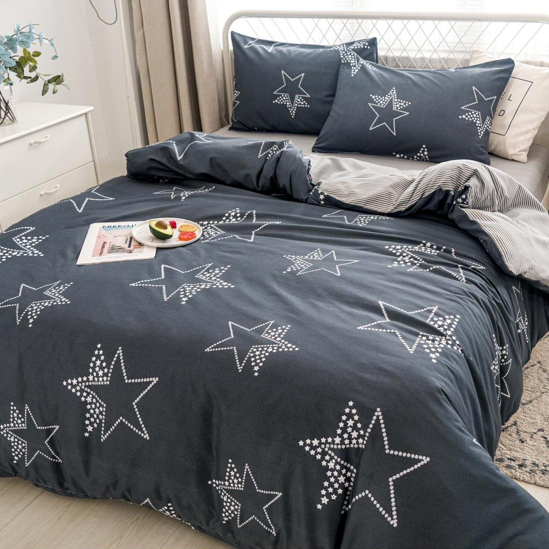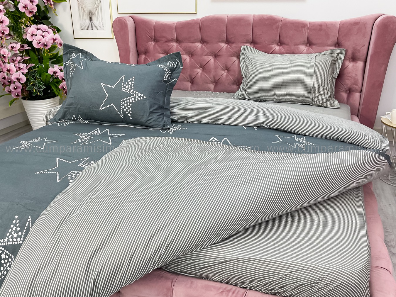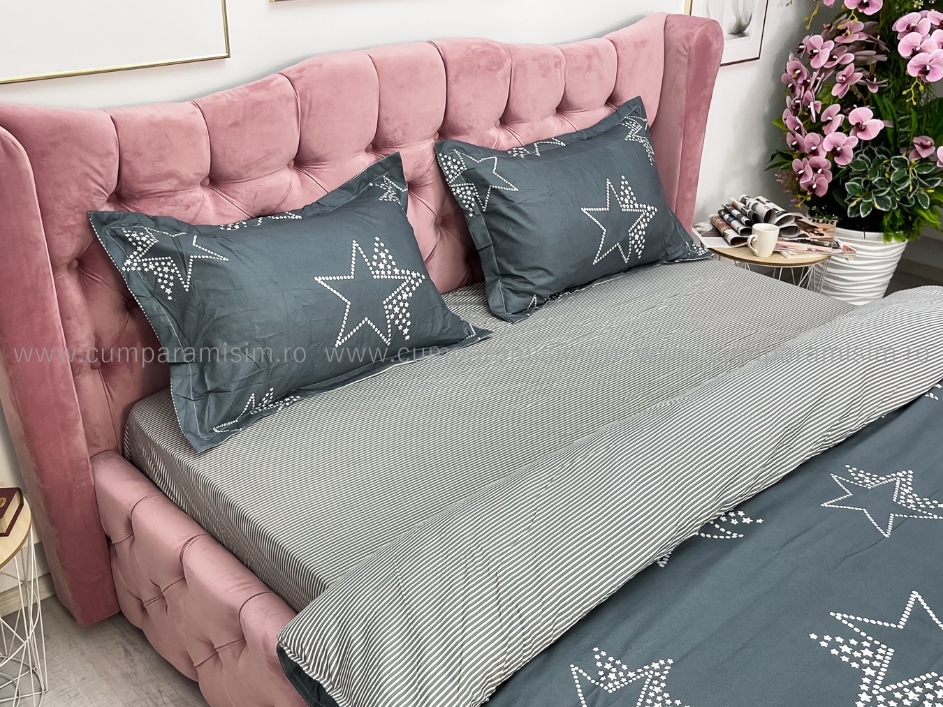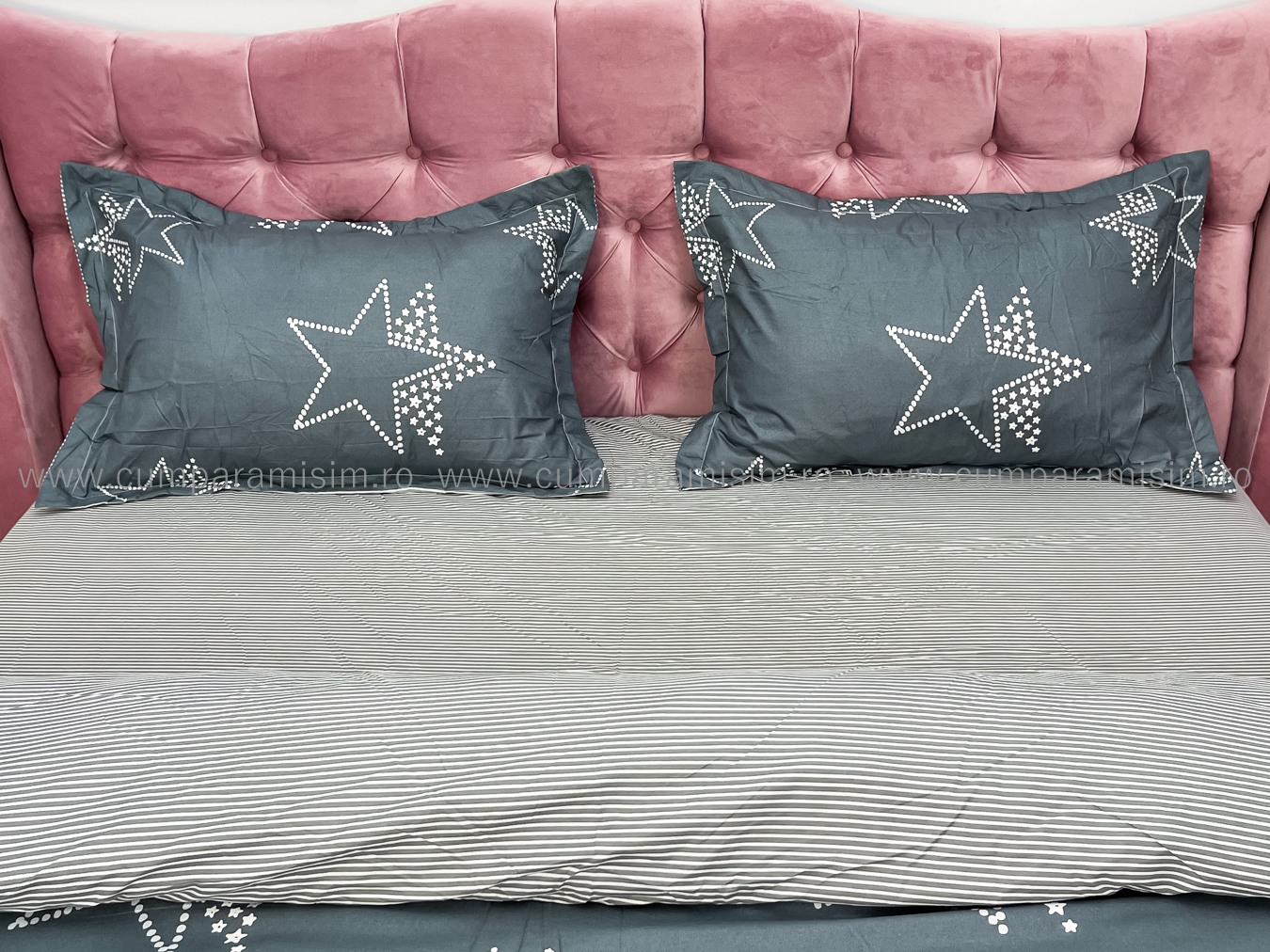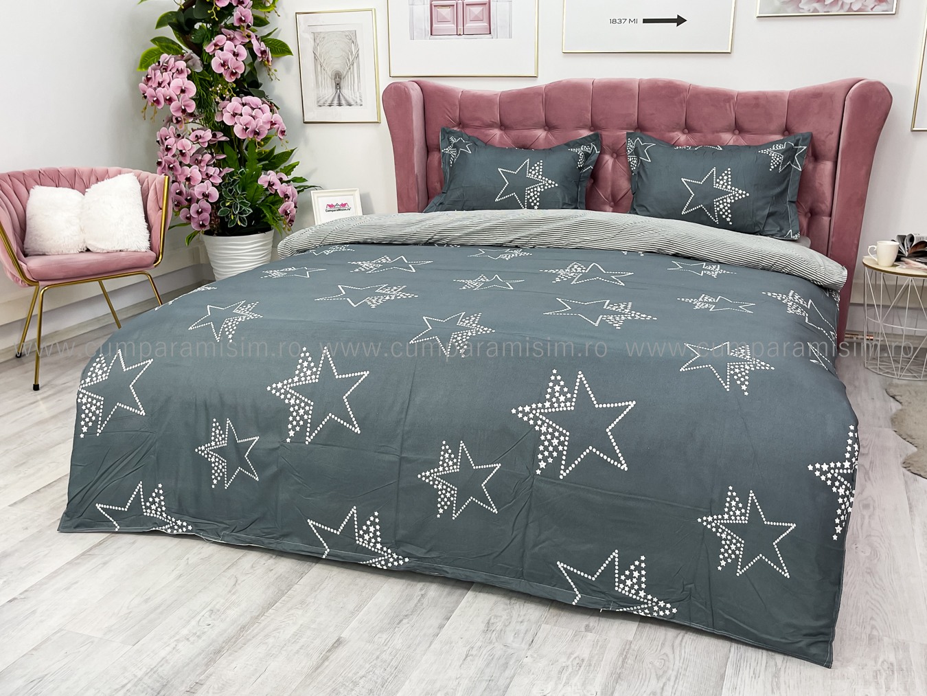 (OFERTA 3 la 219 Lei) Lenjerie pat dublu cu Elastic (160x200cm si 180x200cm), bumbac satinat, Gri, stelute