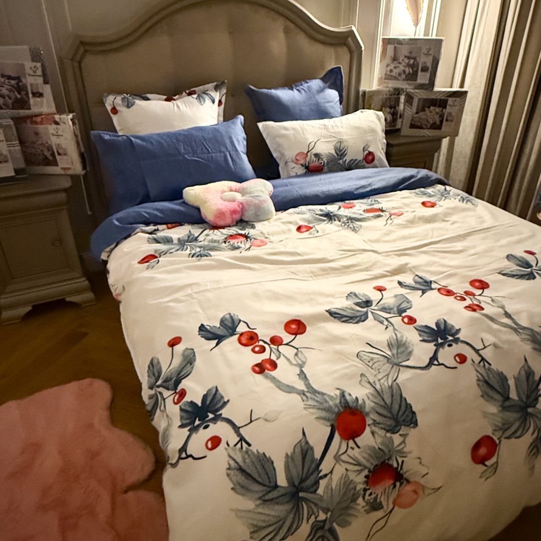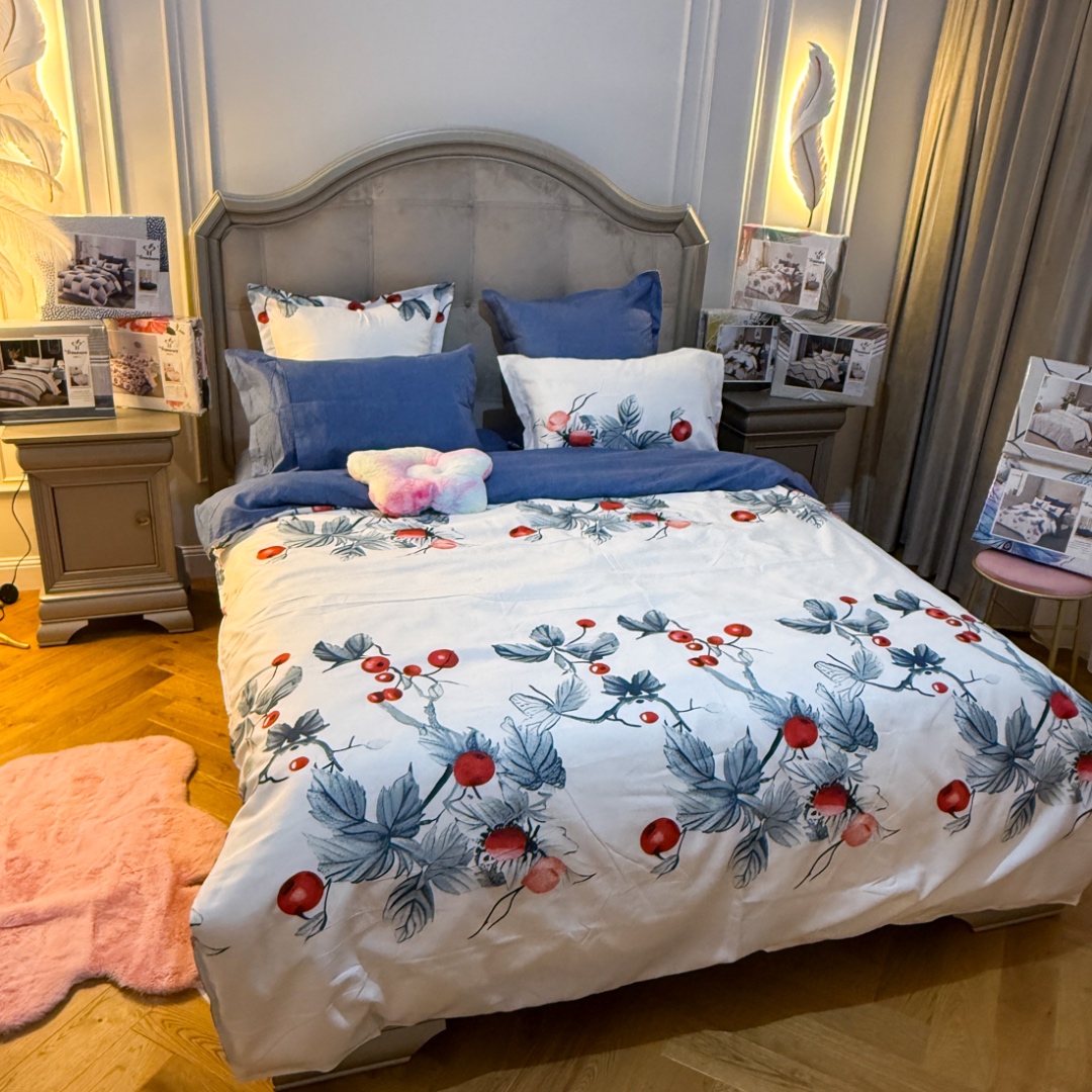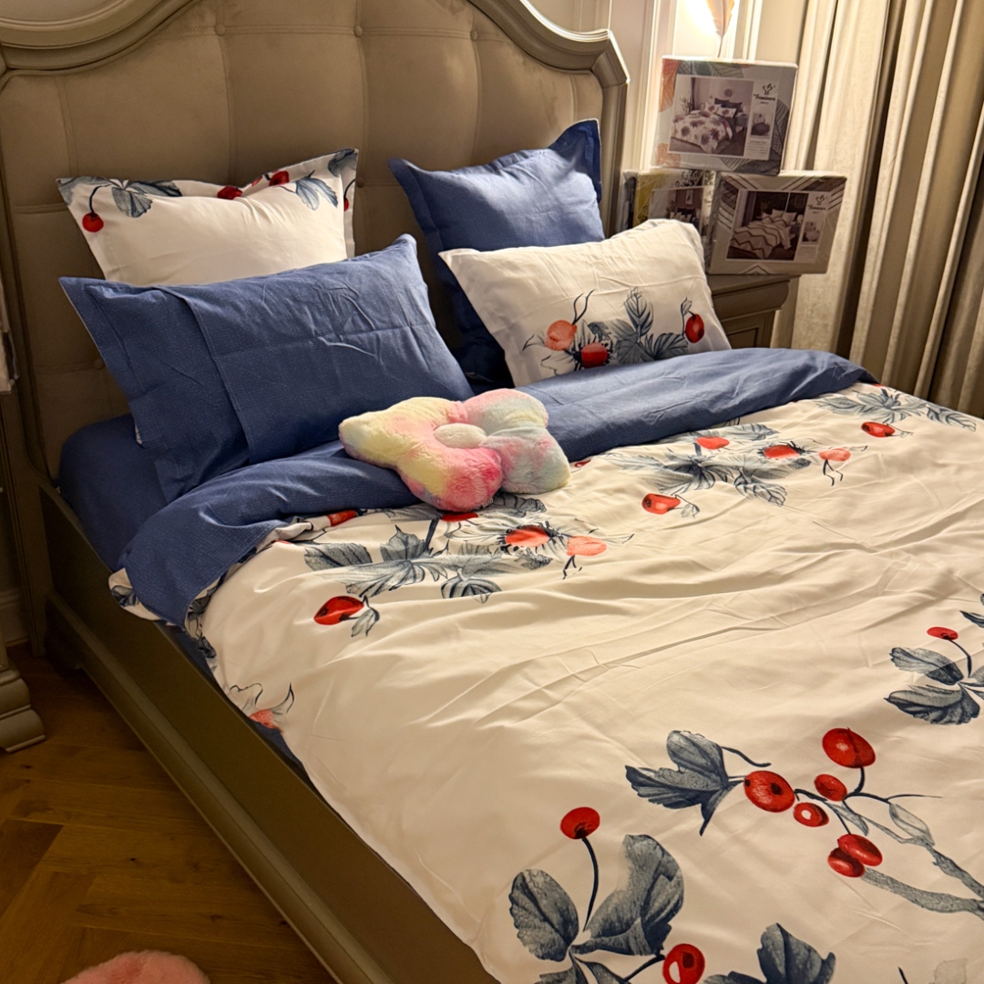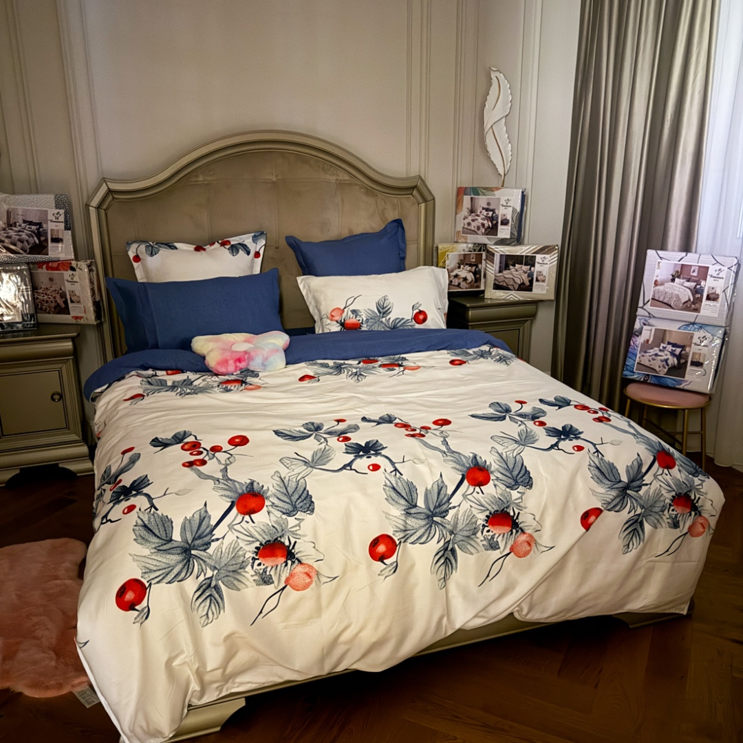 (OFERTA TRIO) Lenjerie Pat Dublu, FINET, 6 piese, Alb, Bleumarin, Rosu, Crengute cu Fructe de Padure