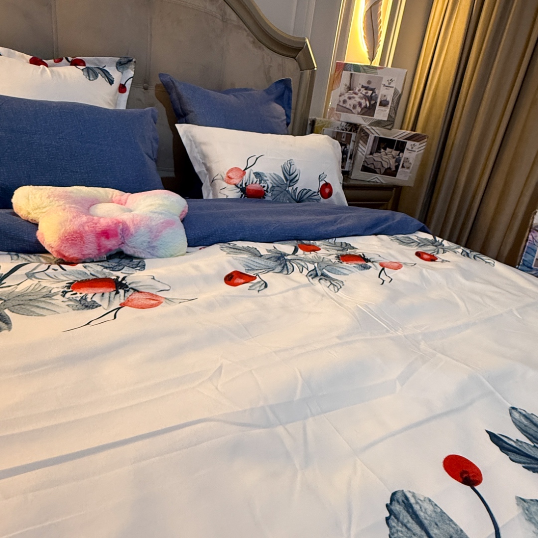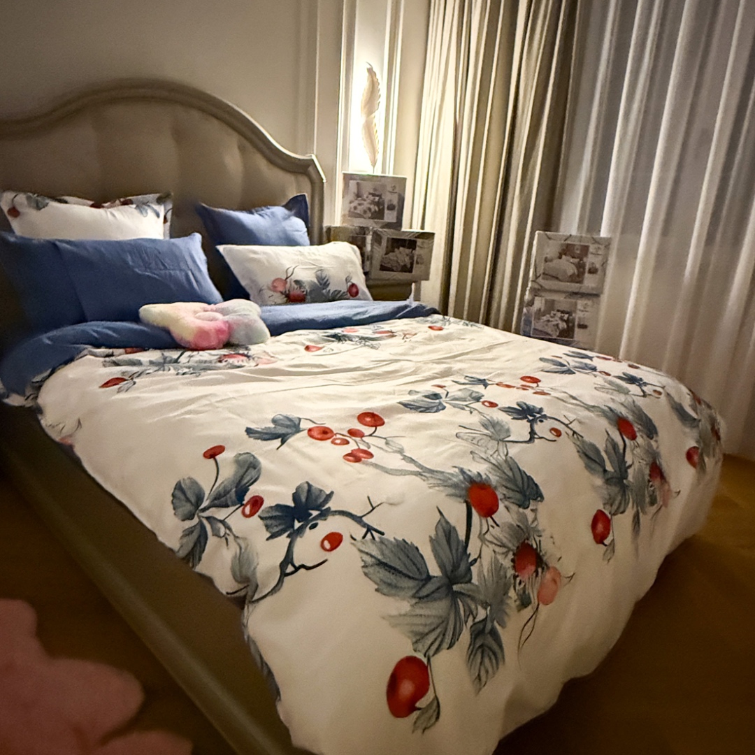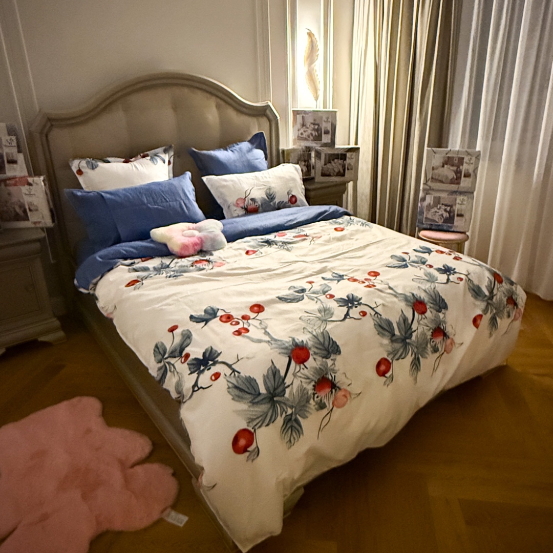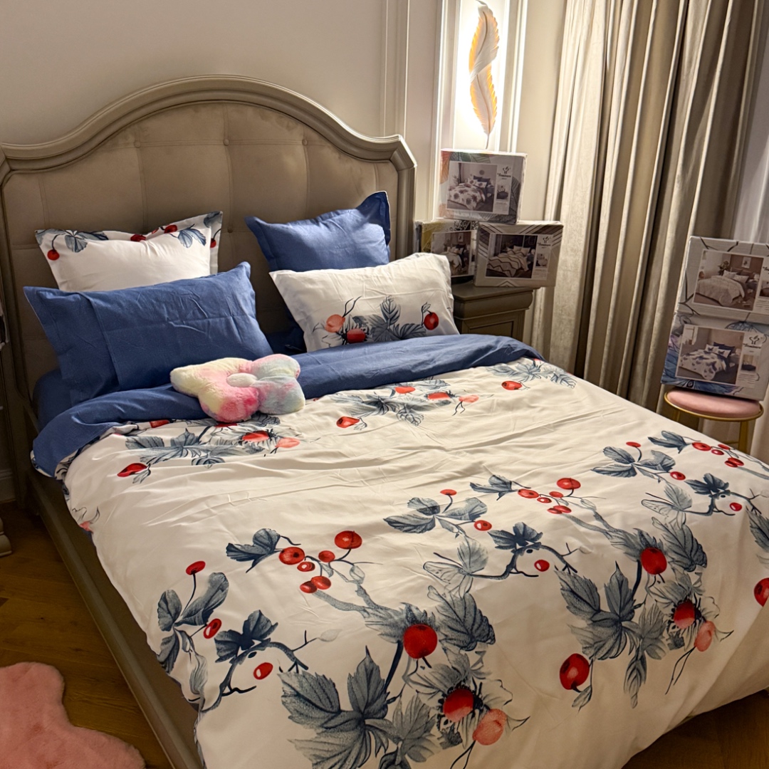 (OFERTA TRIO) Lenjerie Pat Dublu, FINET, 6 piese, Alb, Bleumarin, Rosu, Crengute cu Fructe de Padure