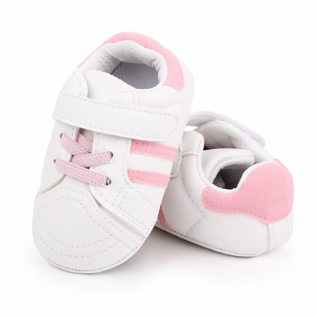 Marimi: 3 -6 luni ( lungime talpita la interior 10,5 cm, lungime talpita la exterior 11 cm) 6-9 luni ( lungime talpita la interior 11,6 cm, lungime talpita la exterior 12 cm) 9-12 luni (lungime talpita la interior 12,7 cm, lungime talpita la exterior 13 cm) Adidasi pentru fetite din material tip piele ecologica, cu dungi roz si insertie din material tip piele intoarsa la spate. Se inchid cu sireturi din elastic si bareta cu arici. Culoare: alb Talpa: material tip piele ecologica cu insertie de cauciuc antiderapant