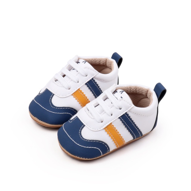 Marimi: 3-6 luni (lungimea talpitei: la interior - 10,5 cm; la exterior - 11 cm) 6-9 luni (lungimea talpitei: la interior - 11,5 cm; la exterior - 12 cm) 9-12 luni (lungimea talpitei: la interior - 12,5 cm; la exterior - 13 cm) Culoare: alb cu bleumarine Material: piele ecologica Inchidere: sireturi Talpa: cauciuc moale, antiderapant Pantofiori sport pentru bebelusi, perfecti pentru micutii care fac primii pasi. Designul modern, cu detalii in culori de albastru si portocaliu, adauga un plus de stil, in timp ce talpa flexibila, cu model antiderapant, ofera siguranta si confort. Realizati din materiale moi si respirabile, acesti pantofiori permit picioruselor sa respire si sa se miste liber. Inchiderea cu sireturi face ca incaltarea si descaltarea sa fie rapide si usoare, oferind in acelasi timp o fixare sigura pe picior.