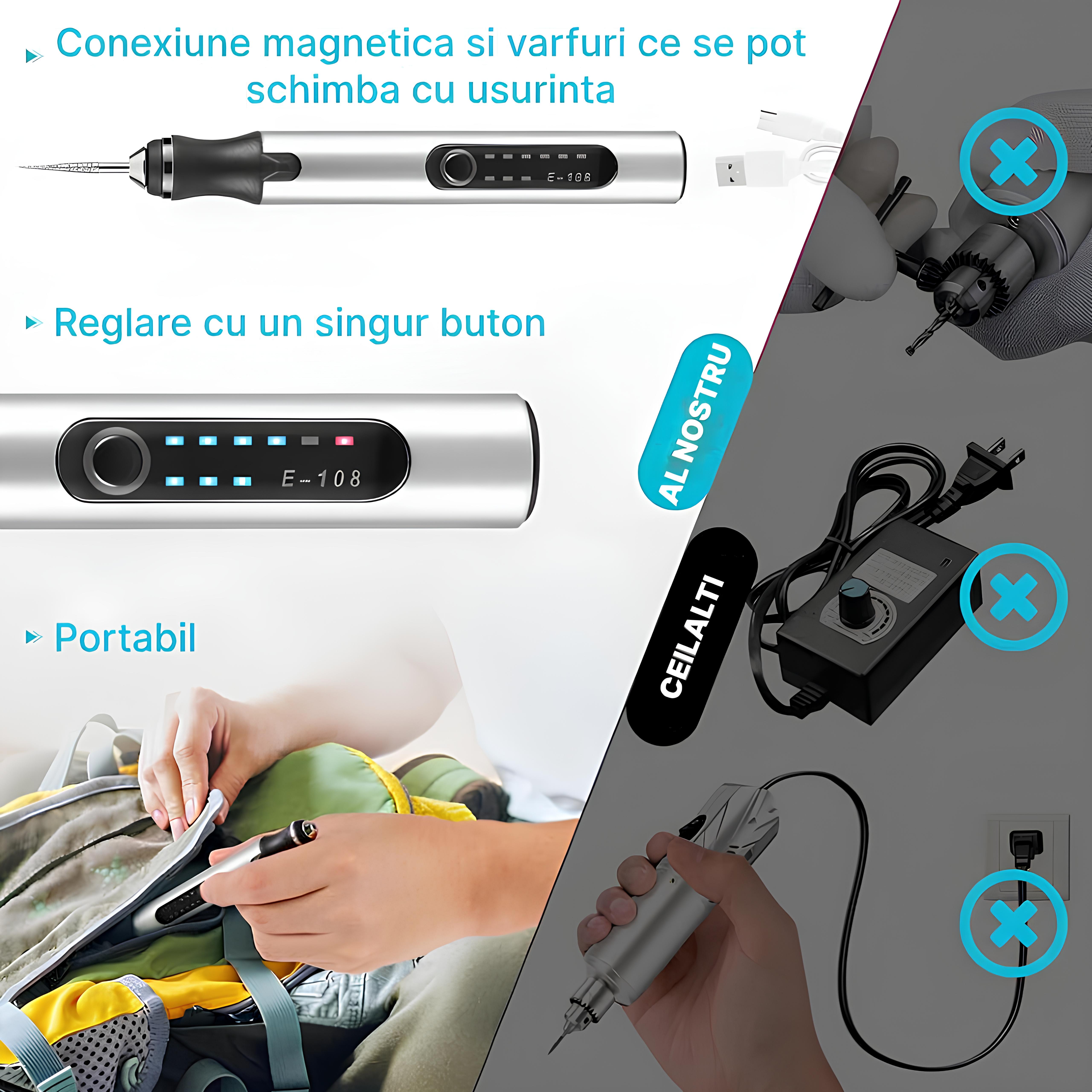 Aparat Multifunctional pentru Gravat: Descopera o Lume de Creativitate!/nTransforma-ti ideile in realitate cu acest aparat de gravat versatil si puternic, perfect pentru o varietate de proiecte, de la sculpturi detaliate la inscriptii personalizate./n/nCaracteristici cheie:/n/nMultifunctional: Graveaza, sculpteaza, inscripționează, perforează, lustruiește și taie diverse materiale, inclusiv metal, sticla, piatra, piele și lemn./nReincarcabil USB: Bateria de 300mah ofera o autonomie de pana la 2 ore, iar incarcarea se face convenabil prin USB./nPutere si precizie: Motorul de 8W ofera o viteza de rotatie de pana la 18000 RPM, asigurand o gravare precisa si eficienta./n3 viteze: Alege viteza potrivita pentru materialul și proiectul tau./n40 de accesorii incluse: Setul include o varietate de capete de gravare, burghie, discuri de lustruire și șmirghel pentru a te ajuta sa incepi imediat./nUsor de utilizat: Designul ergonomic și intuitiv il face usor de manevrat și controlat./nSiguranta: Aparatul este dotat cu o protectie la suprasarcina pentru a te proteja pe tine și aparatul./n/nBeneficii:/n/nCreativitate fara limite: Transforma-ti ideile in realitate cu acest instrument versatil./nPersonalizare: Adauga o nota personala obiectelor tale preferate prin gravare./nProiecte DIY: Realizeaza proiecte de artizanat unice și originale./nCadouri perfecte: Creeaza cadouri personalizate și memorabile pentru cei dragi./nEconomiseste timp și bani: Nu mai e nevoie sa apelezi la profesionisti pentru a grava obiecte./n/nCe ne diferentiaza:/n/nMotor puternic: Performanta superioara pentru rezultate impecabile./nViteze reglabile: Adaptabilitate la diverse materiale și proiecte./nGama larga de accesorii: Soluție completa pentru nevoile tale creative./nSiguranta sporita: Protectie pentru tine și aparatul tau./n/nProiecte posibile cu aparatul multifunctional de gravat:/nPersonalizare:/n/nBijuterii: Gravuri cu nume, mesaje speciale, simboluri zodiacale, modele florale sau geometrice pe pandantive, bratari, inele, cercei etc./nTelefoane:<span font-variant-/n