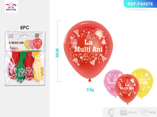 Baloane din Latex Engros, Set 6 Bucăți, Dimensiune 30 cm, Diverse Mesaje și Culori – Ideale pentru Magazine de Articole de Petrecere, Papetării, Supermarketuri, Magazine de Jucării și Comercianți Online! Vă oferim o selecție variată de baloane din latex, disponibile pentru vânzare engros, perfecte pentru a adăuga o notă festivă oricărei ocazii speciale, de la zile de naștere la sărbători și evenimente. Fiecare set conține 6 baloane cu o dimensiune de 30 cm, ideale pentru decoruri interioare și exterioare. Aceste baloane vin într-o gamă largă de culori vibrante și cu mesaje diverse. Fiecare set de 6 baloane este ambalat într-un pachet individual din plastic transparent, cu carton colorat, asigurând o prezentare atractivă și protejată a produsului. Informațiile de pe ambalaj includ cantitatea (6PC) și dimensiunea (30cm), facilitând identificarea rapidă a produsului.