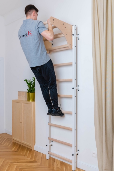 Bară de tracțiunePB204din lemn de stejar reglabilă pentru spalierele BenchK cu cadru din oțel negru APLICAT NUMAI PENTRU SPALIERELE DE PERETE BENCHK Este o completare excelentă pentru orice spalier de perete BenchK, care extinde gama largă de opțiuni de exerciții disponibile. Datorită construcției sale detașabile, bara de tragere poate fi poziționată pe diferite trepte și ajustată la înălțimea utilizatorului. Cu bara de tracțiuni puteți efectua o gamă largă de exerciții de trageri, de bază, de condiționare a spatelui și a umerilor. De asemenea, permite efectuarea de intinderi a coloanei vertebrale, antrenament de mobilitate si rezistenta, atunci cand i se ataseaza curele sau benzile de rezistenta. Această bară de tragere ajută la menținerea unui corp puternic și flexibil, fără a compromite estetica mediului înconjurător. Pentru a profita la maximum, asociați-l cu un blat BenchK (nu este inclus), pentru a crea fie un birou de lucru în picioare, fie în picioare și pentru a combina spațiul de lucru și de antrenament în zona dvs. de locuit