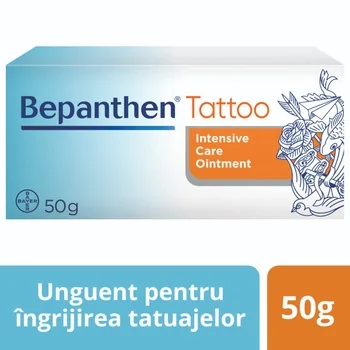 Bepanthen® Tattoo este un unguent pentru ingrijirea tatuajelor. Contine Panthenol, ce ajuta la regenerarea rapida a pielii si creeaza un strat protector natural, non-ocluziv. Acesta asigura nivelul optim de hidratare in piele, ce ajuta la regenerarea acesteia din interior, stabilizand, in acelasi timp, functia naturala de protectie a pielii. Ingrediente: AQUA; LANOLIN; PARAFFINUM LIQUIDUM; PETROLATUM; PANTHENOL; PRUNUS AMYGDALUS DULCIS OIL; CERA ALBA; CETYL ALCOHOL; STEARYL ALCOHOL; OZOKERITE; GLYCERYL OLEATE; LANOLIN ALCOHOL. Mod de utilizare: Bepanthen® Tattoo unguent pentru tatuaje se aplica, in strat subtire, pe fiecare tatuaj. Bepanthen® Tattoo formeaza un strat transparent, fara a lasa o pelicula alba, groasa, si nu necesita clatire. A se aplica unguentul de 4 ori pe zi pentru rezultate optime. Forma de pezentare: 50g.
