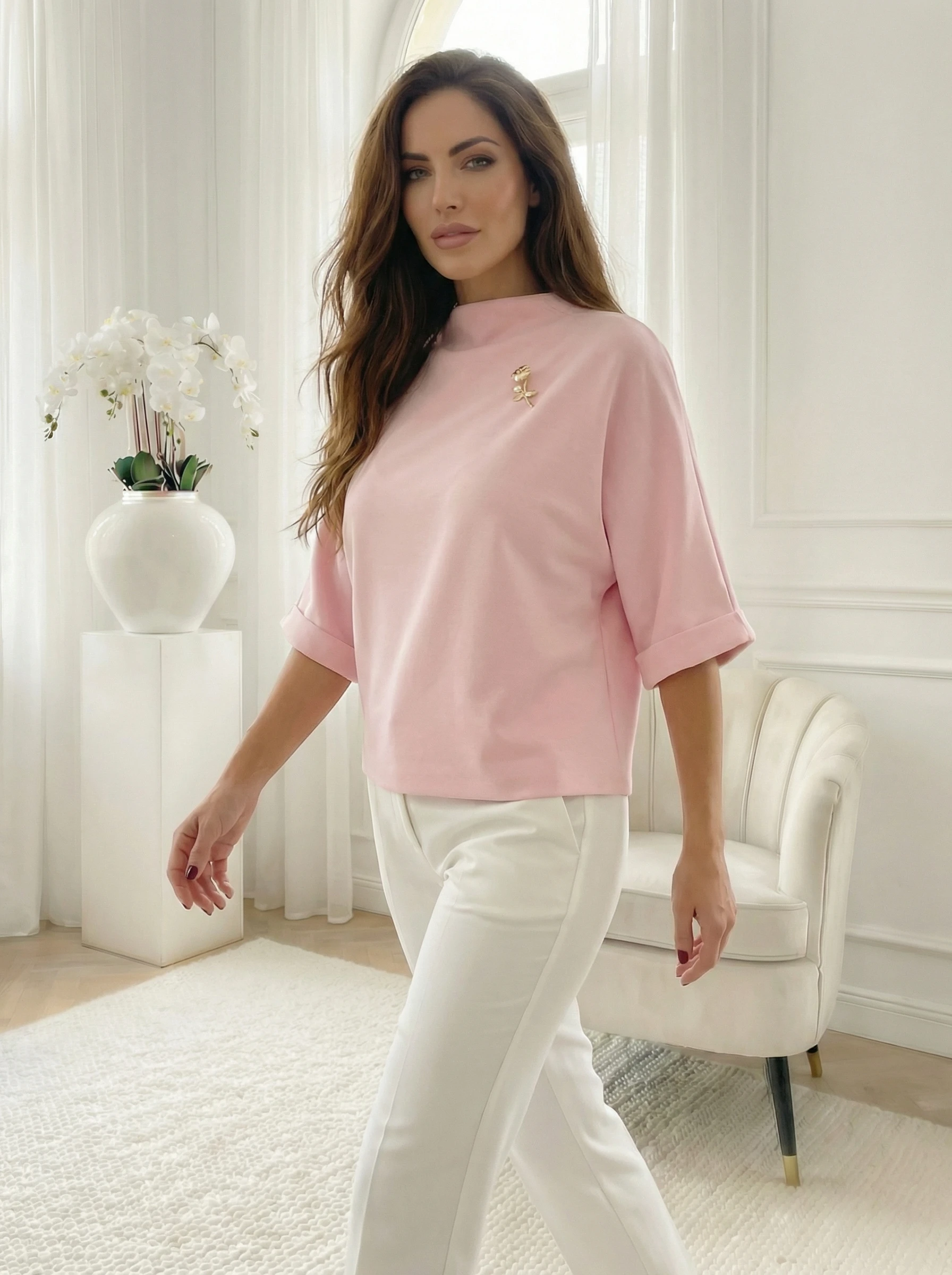 Bluza dama roz cu brosa floare aurie este o piesa eleganta, usor de integrat in garderoba feminina. Croiala lejera ofera confort si libertate de miscare. Designul minimalist pune accent pe detaliile fine. Brosa floare roz cu perluta adauga un plus de raf