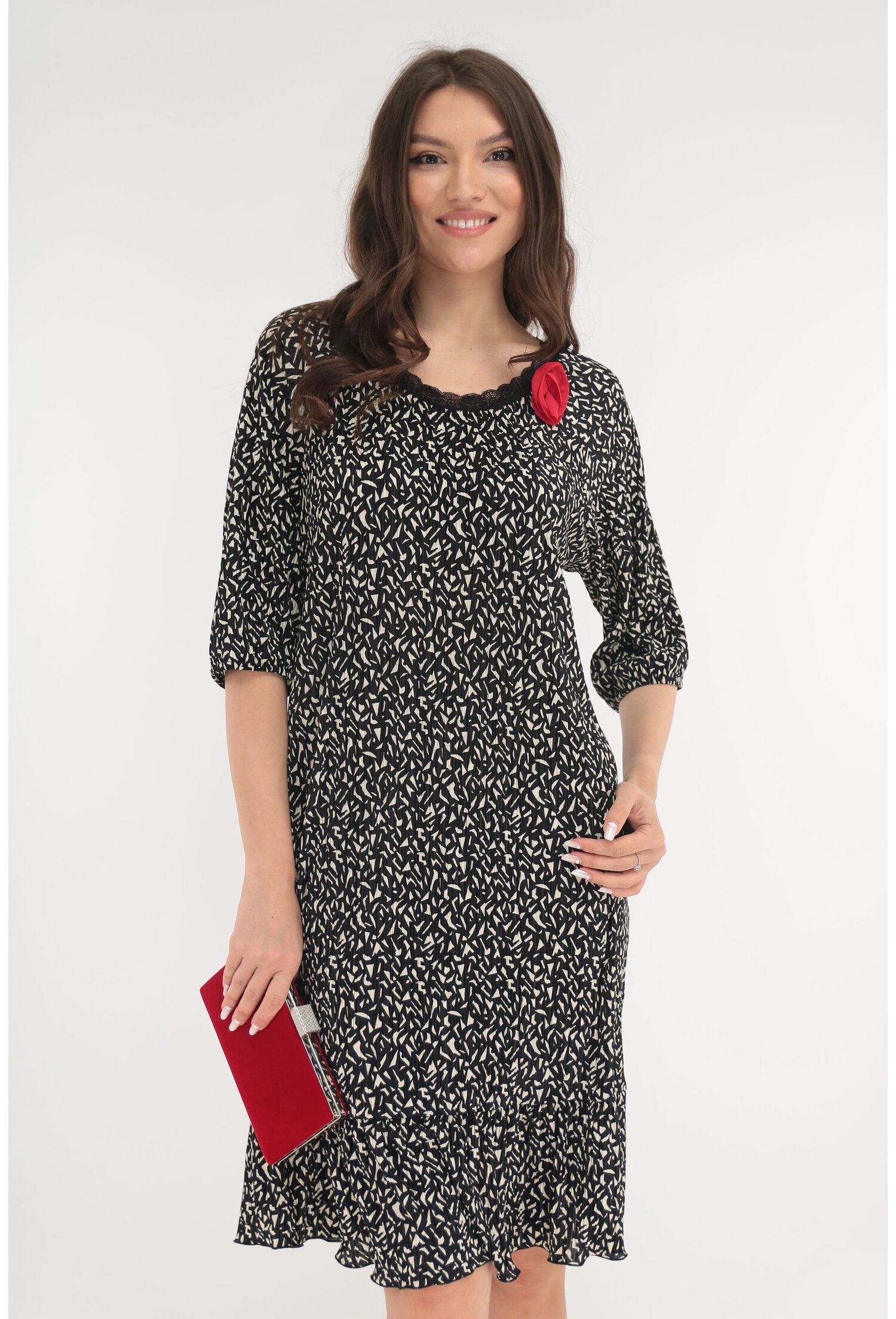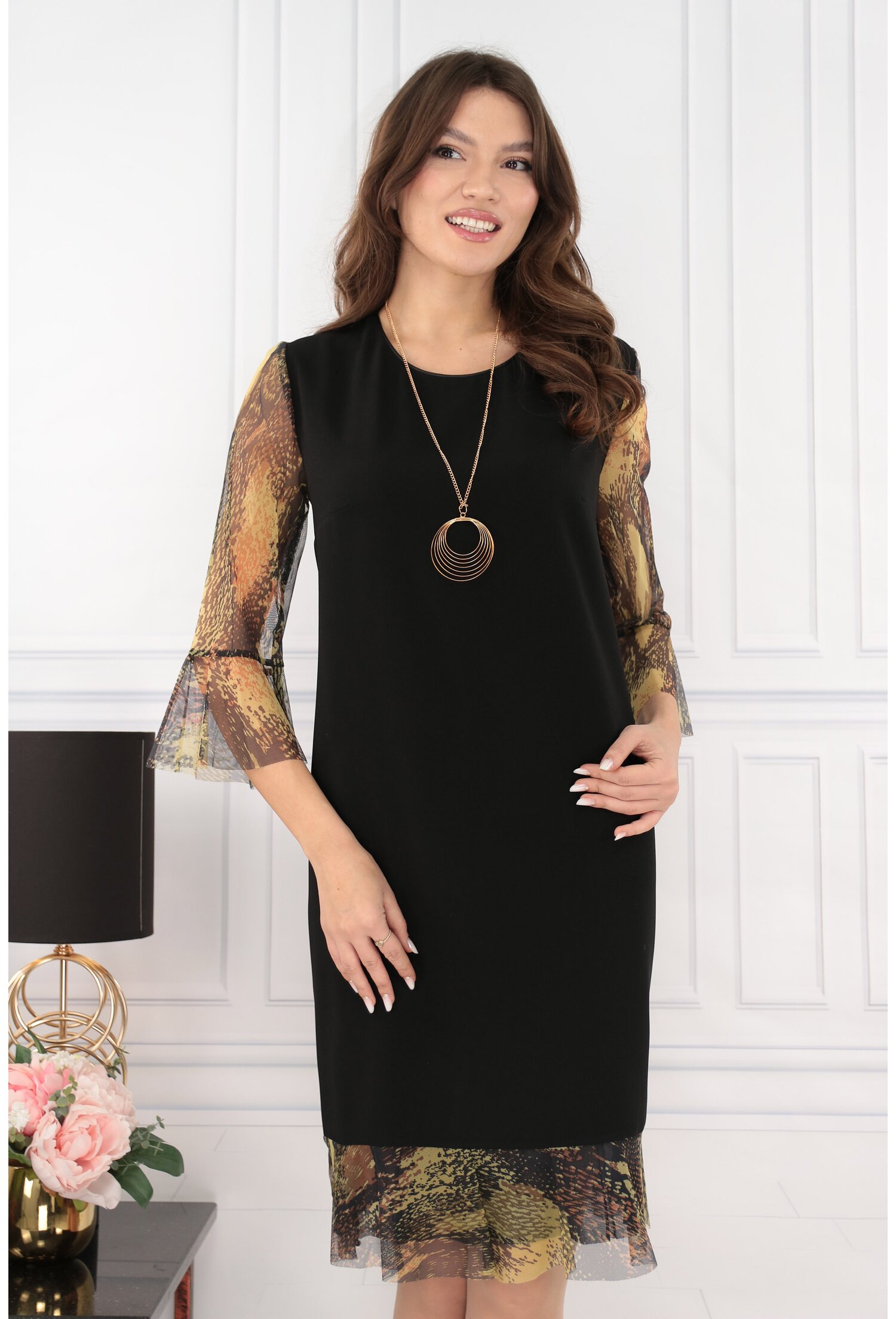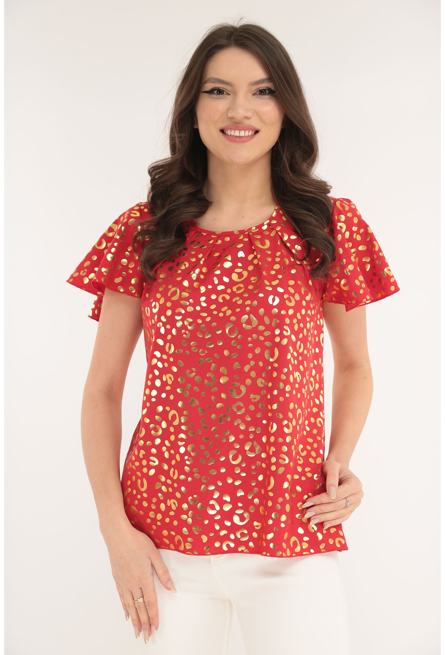 -Bluza eleganta alba cu print auriu -Confectionata din testaura fina, elastica tip matase -Croiala lejera -Decolteu rotund cu pliuri -Maneci scurte cu volanase ample -Fabricat in Romania MATERIAL: 60% Poliester, 40% Vascoza LUNGIME: 63 cm la marimea 40; lungimea bluzei creste cu 1 cm la fiecare marime