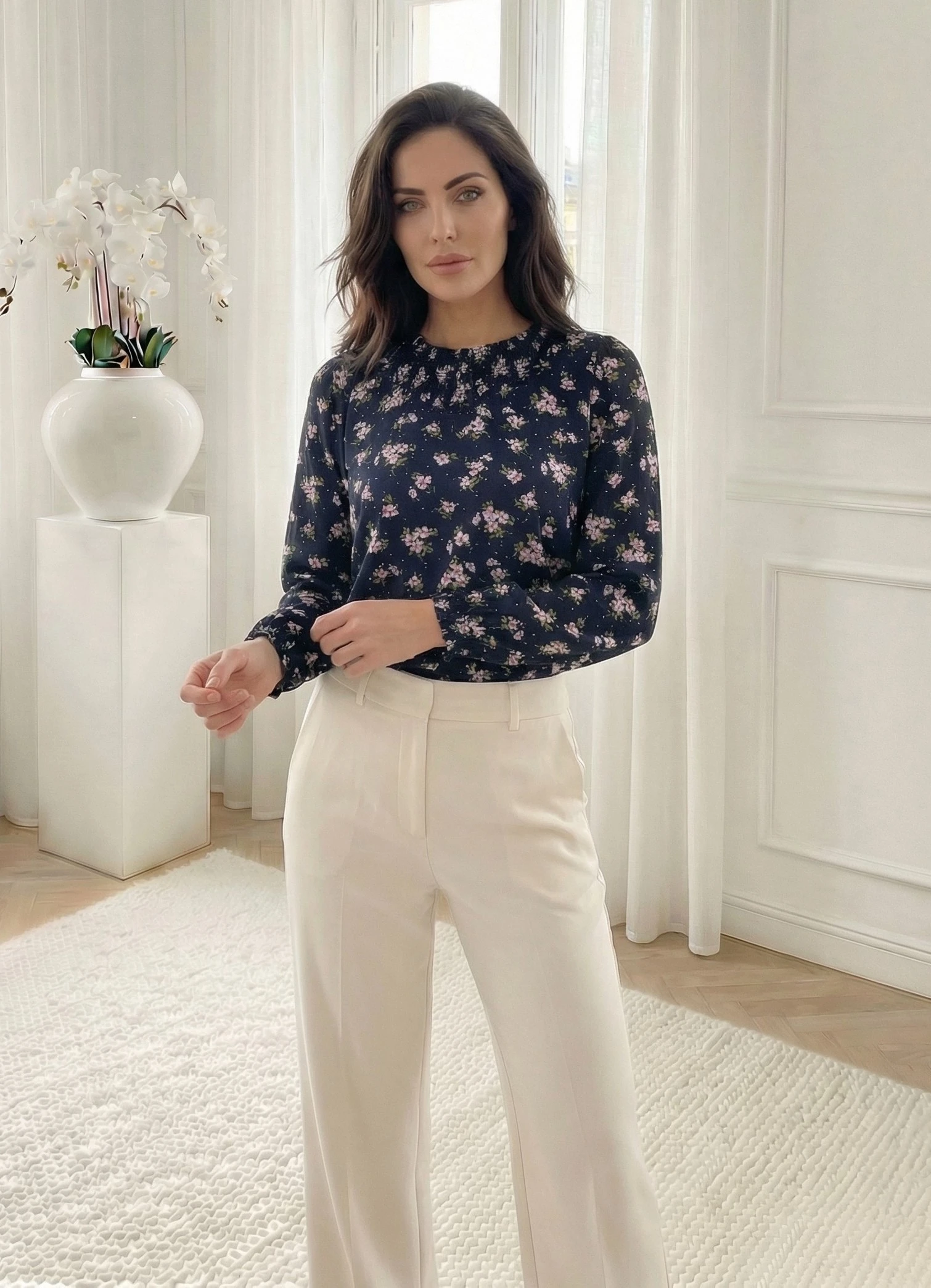 Bluză elegantă bleumarin cu model floral - se remarca prin croiala lejeră și textura plină a materialului, oferind confort și opacitate pe tot parcursul purtării. Este o piesă versatilă, ideală pentru a fi purtată cu pantaloni cu talie înaltă, potrivită a