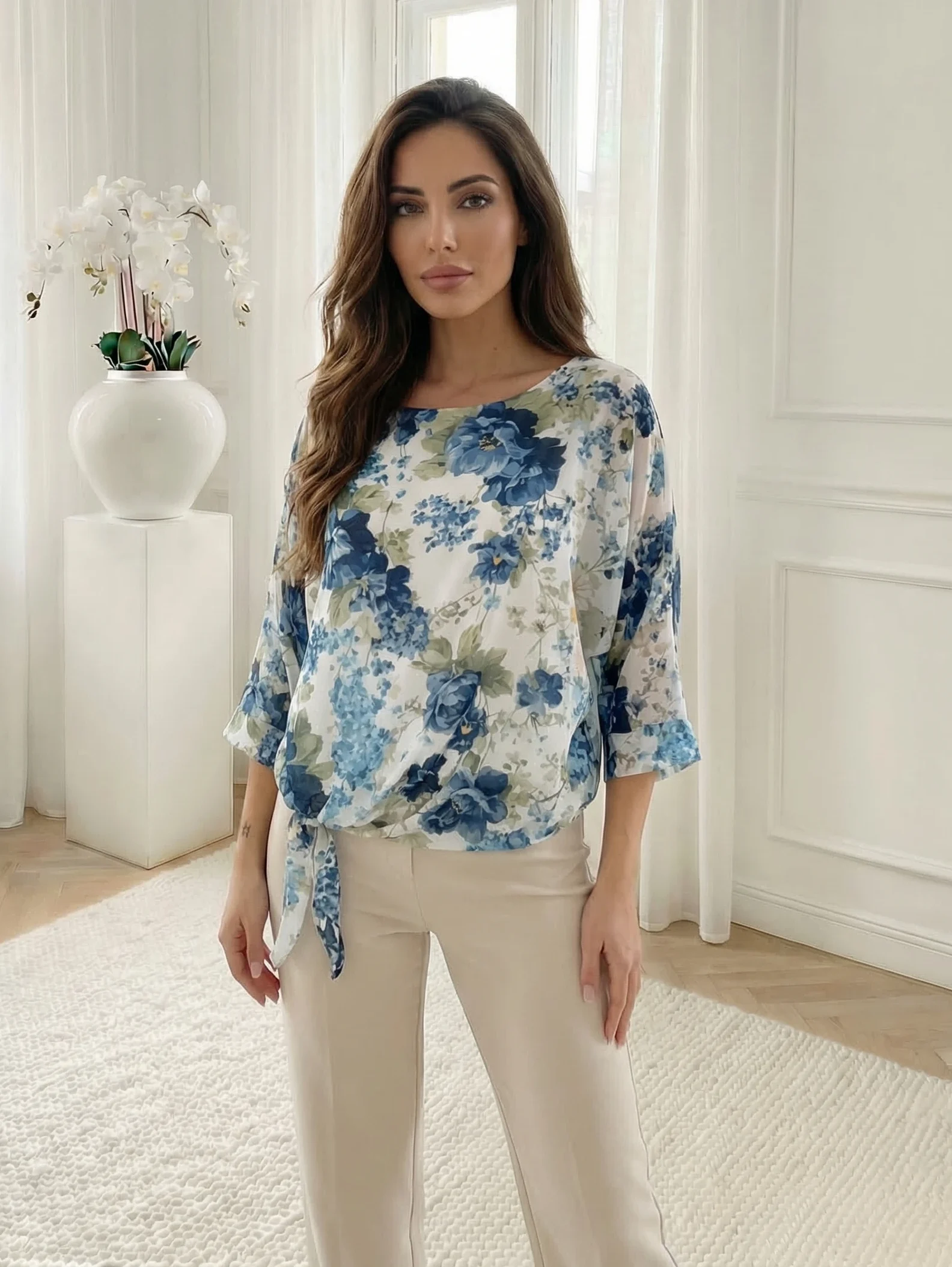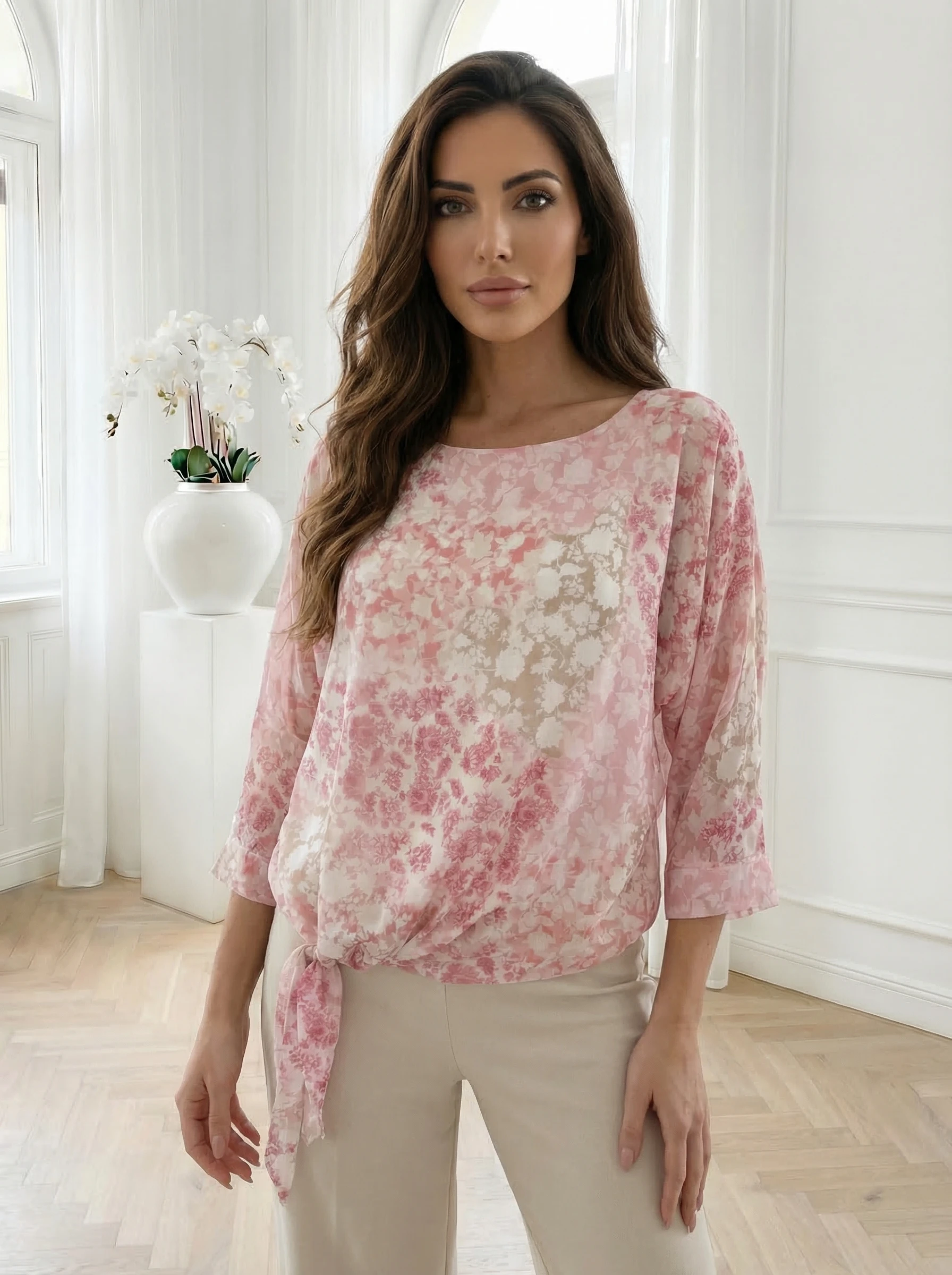 Bluză elegantă cu decolteu în v și imprimeu floral trandafiriu impresionează prin imprimeul floral vibrant pe fundal negru și croiala feminină cu decolteu în V. Este o piesă versatilă și sofisticată, perfectă pentru a fi purtată cu pantaloni office negri