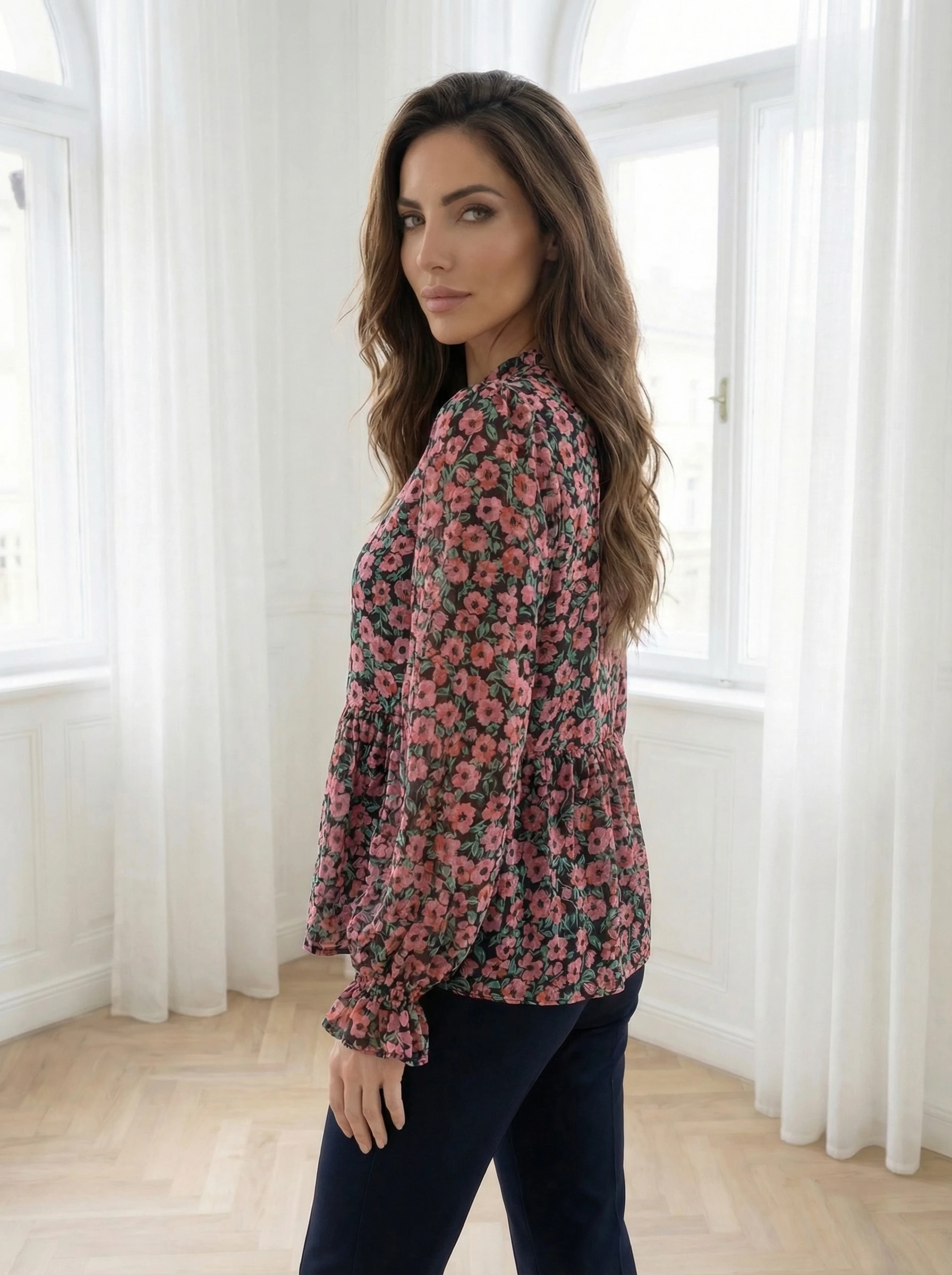 Bluza eleganta cu volane si imprimeu floral roz, o piesa sofisticata ce imbina rafinamentul cu un design modern, fiind ideala pentru a pune in evidenta feminitatea oricarei tinute. Aceasta bluza dispune de o captuseala interioara fina care asigura opacita