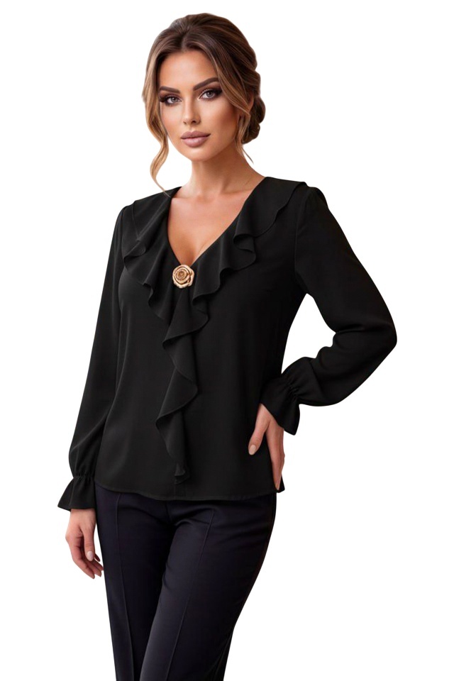 Bluza eleganta de dama, NORIA, cu volane si brosa aurie, Negru, Marime S/M