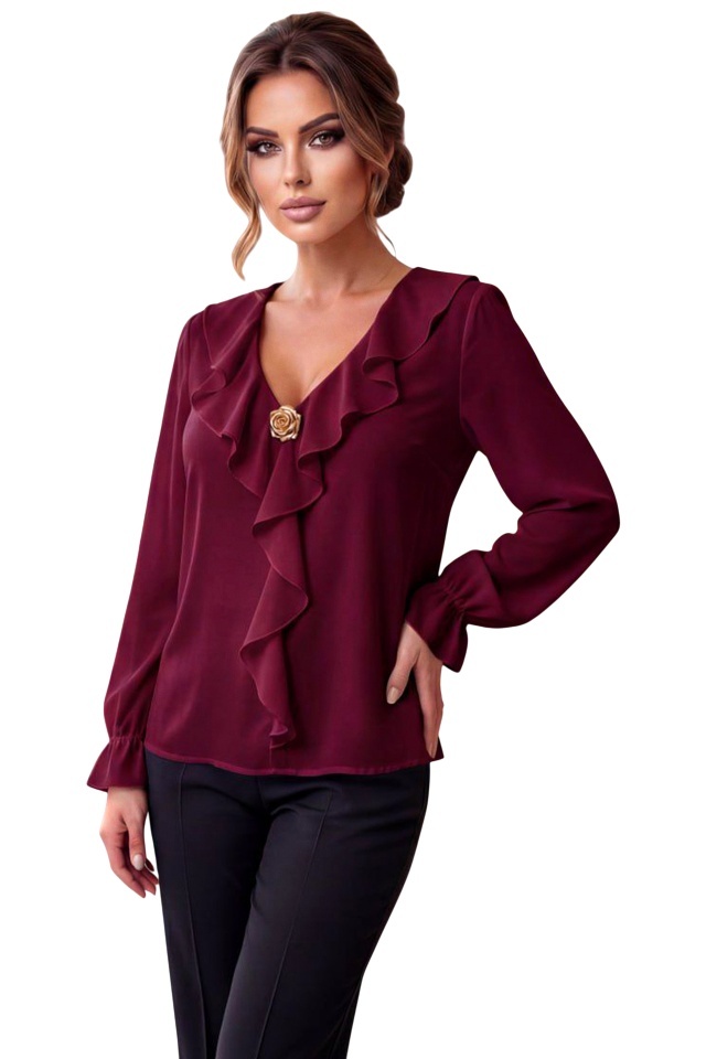 Volane care spun povesti, stil care atrage privirea. O bluza care reda farmecul romantic intr-o forma moderna. Bluza NORIA este o piesa feminina, eleganta si extrem de rafinata, creata pentru a oferi un efect vizual delicat si o aparitie inedita in orice context. Materialul vaporos, usor transparent, are o textura fina si aerata care se aseaza cu lejeritate pe corp, conferind un joc frumos de volum si miscare. Lungimea medie o face usor de integrat atat in tinute elegante, cat si in outfituri office sau smart-casual. Jaboul frontal, realizat din volane fine, adauga o nota romantica si accentueaza frumusetea liniei decolteului. Volanele sunt lucrate cu atentie pentru a crea un efect fluid, armonios, care imbogateste vizual partea superioara a bluzei si atrage subtil privirea. Brosa aurie amplasata central completeaza perfect designul, oferind un touch pretios si o stralucire discreta, transformand bluza intr-o piesa potrivita pentru ocazii speciale. Manecile lungi sunt finisate cu mansete decorate cu volane, mentinand tema romantica a designului. Bluza NORIA este ideala pentru fuste elegante, pantaloni conici sau jeansi, fiind o alegere inspirata pentru evenimente, birou sau seri in care iti doresti un look stilat si feminin. Masura universala compatibila cu marimea S sau M Caracteristici bluza: - croiala cu lungime medie de tip relaxed fit - maneci lungi cu mansete cu efect de volane - material vaporos usor transparent - decolteu amplu in V evidentiat de jabou cu volum mediu - model prezent intr-o colectie cromatica - detaliu floral chic, metalic tip brosa Eticheta produsului conține informații esențiale referitoare la întreținerea și spălarea corectă a articolelor vestimentare. Imaginile Fashionforyou au caracter informativ, iar nuanta, tonul si intensitatea culorii pot varia in functie de monitor/ecran telefon.