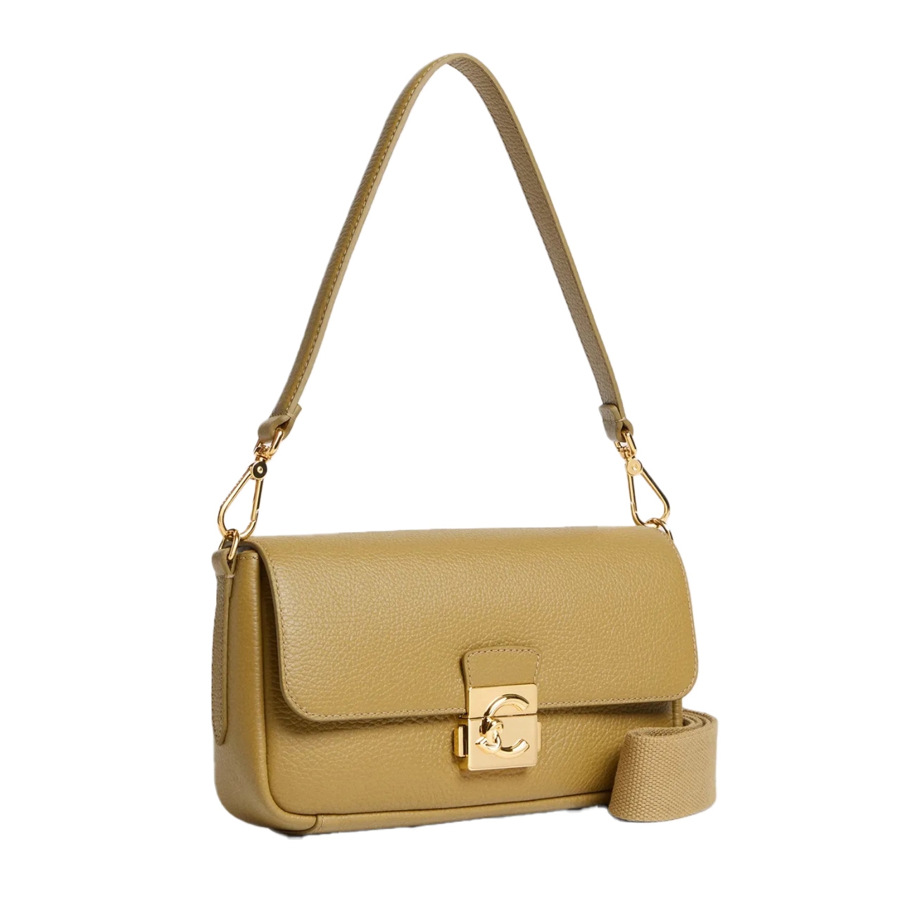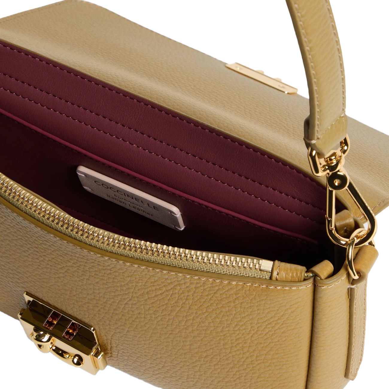C-Me Lock Medium reinterpretă logo-ul emblematic într-o închidere modernă, cu un design echilibrat și funcțional. Realizată din piele embosată, rezistentă și ușor de întreținut, este potrivită pentru purtare zilnică. Silueta structurată este completată de detalii metalice cu finisaj auriu și de închiderea Tuck Lock cu butoane laterale. Mânerul detașabil și cureaua textilă reglabilă permit purtarea pe umăr sau crossbody, iar interiorul cu două buzunare, dintre care unul cu fermoar, asigură organizare practică.