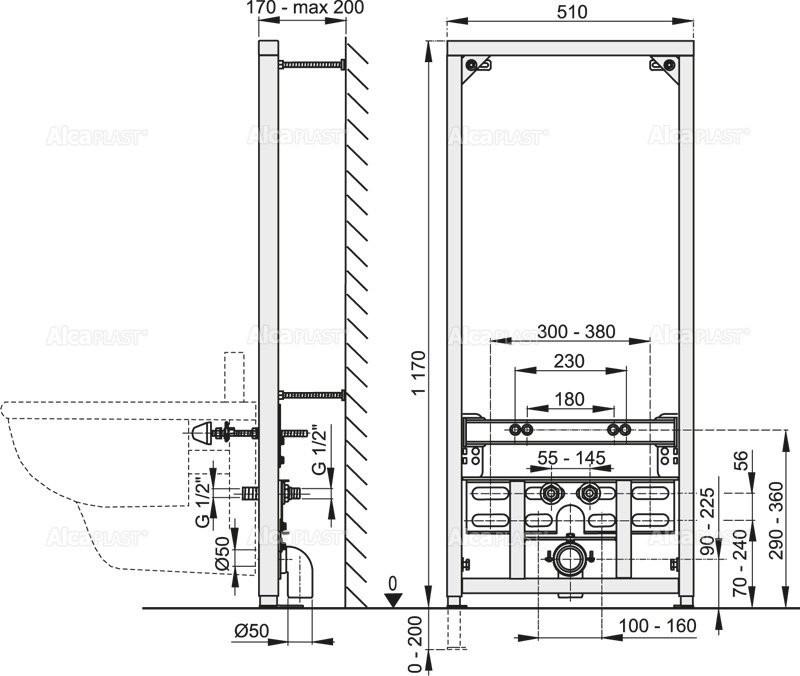 Descriere Pentru bideu suspendat cu prinderea de 180 mm sau 230 mm. Pentru montare robinet. Pentru montare pe perete portant sau pentru construcții din gips-carton. Test de sarcina 400 kg. Specificatii: Picioare telescopice reglabile, plajă de reglaj 0-200 mm Suporți alimentare cu apă 55-145 mm Material: metal acoperit cu pulbere Conținutul pachetului Cadru de montaj cu susținere proprie Fitinguri de conectare G1 / 2 - G1 / 2 Cot evacuare HT50 cu izolație Cod producator A105/1200 Greutate 11.72 kg Producator Alcaplast Dimensiune 1190x523x90 mm UM buc Garantie 15 ani