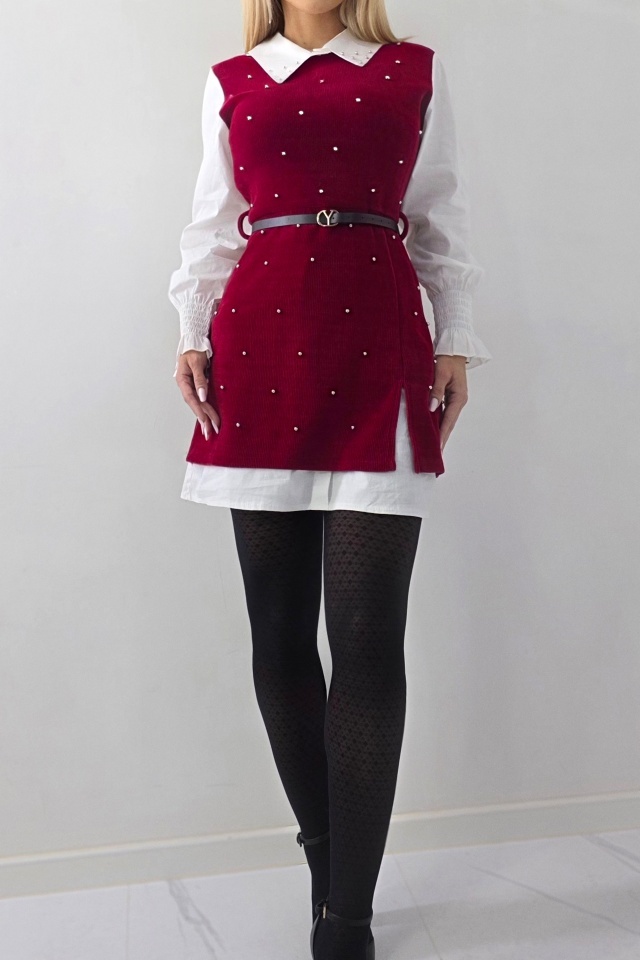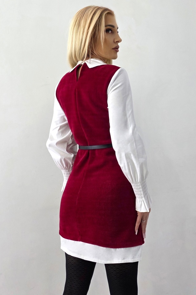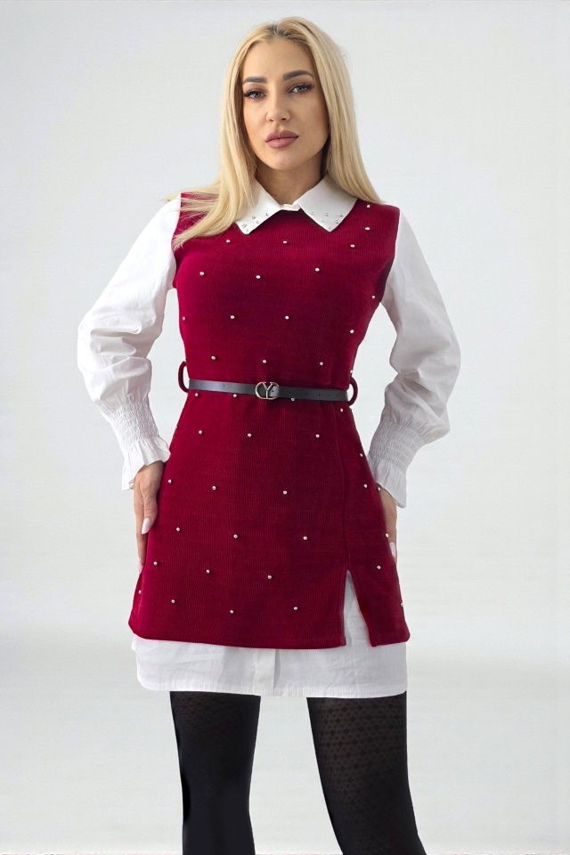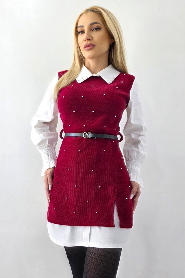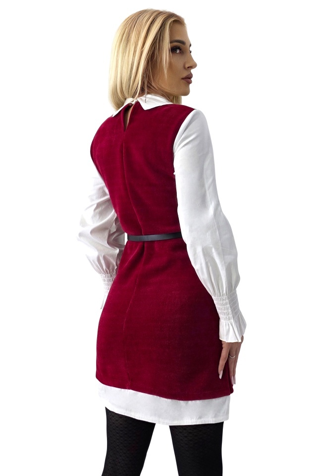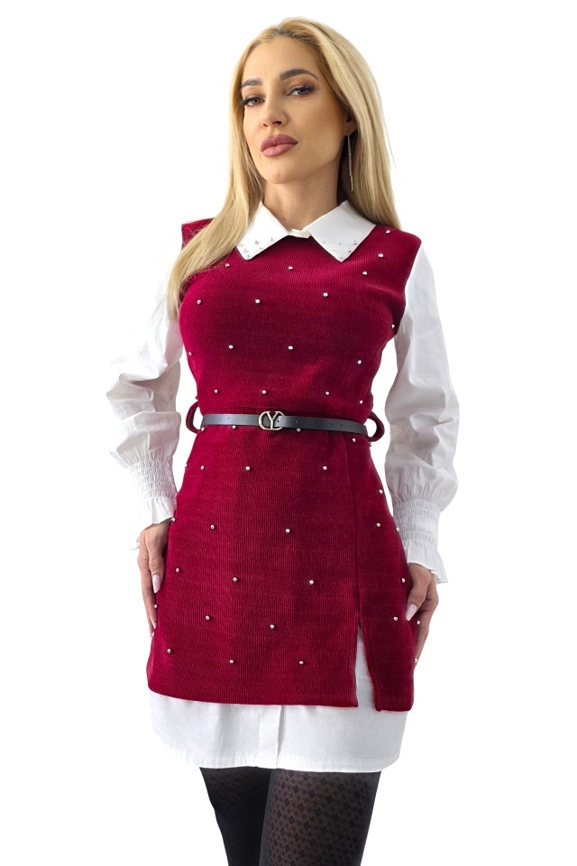 Camasa rochie Iuliana, cu sarafan aplicat si curea asortata, Rosu bordo, Marime S/M