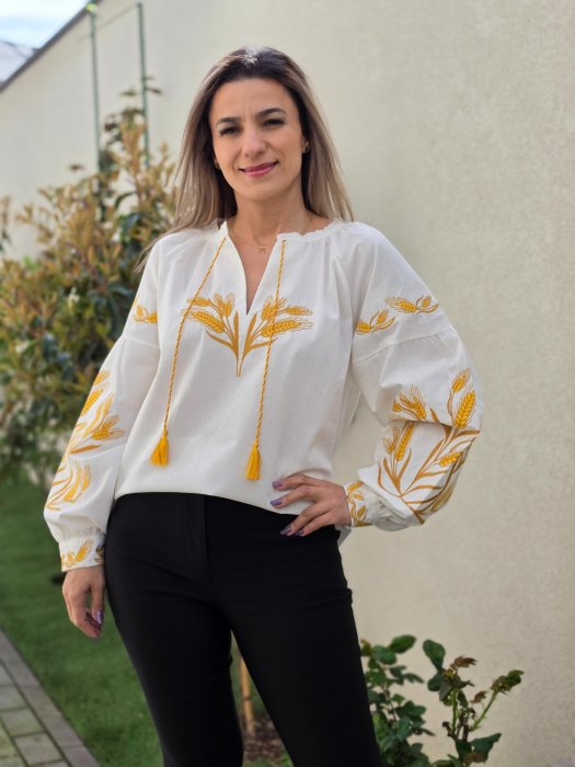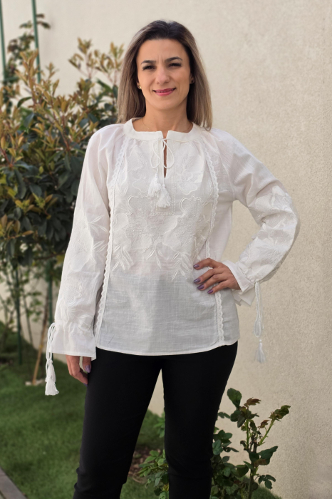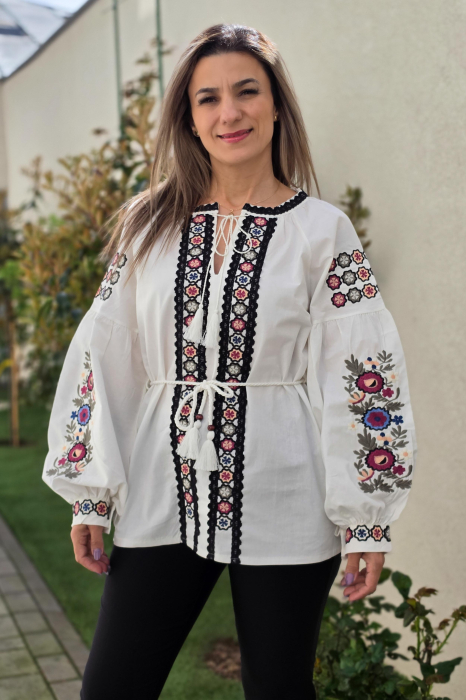Bluza cu tematica traditionala lejera la purtat. Material: Bumbac 100%, fin la atingere. Broderie cusuta la masina. Culoare: alb cu broderie neagra Marimi disponibile: S , 105cm circumferinta bustului, lungimea 68cm M , 110cm circumferinta...