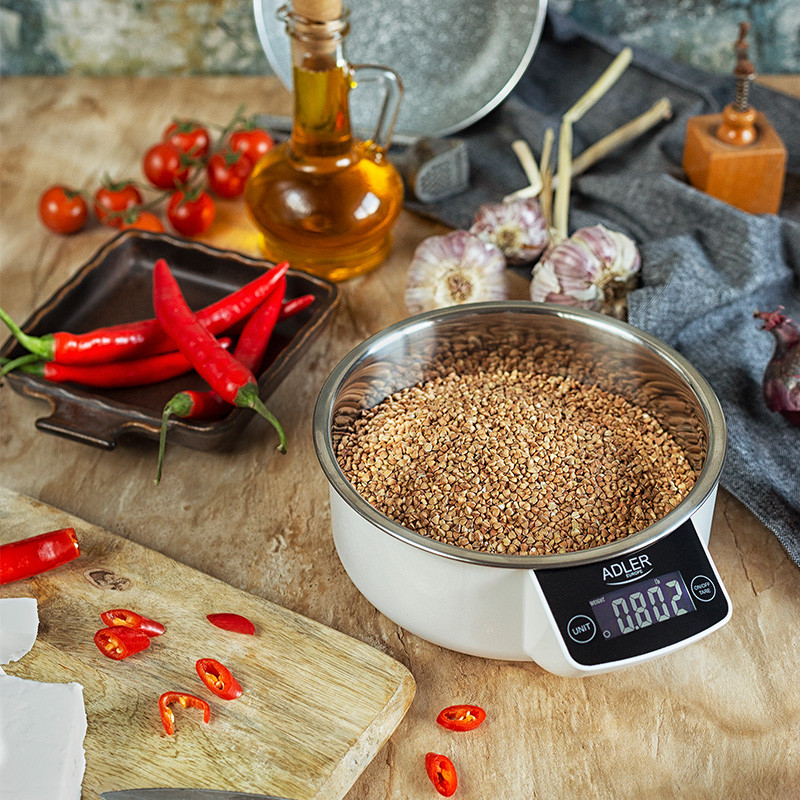 Descriere: Cantar electronic de bucatarie cu o sarcina maxima de 5 kg si o precizie de 1 g. Extrem de util in pregatirea mancarurilor care necesita proportii strict definite de produse. Va permite sa cantariti cu precizie chiar si cantitati mici de produse.Raspunde nevoilor persoanelor carora le pasa de marimea meselor din motive de sanatate.Are optiunea de oprire automata sau manuala si un afisaj clar. Vasul estetic din otel inoxidabil este usor de pastrat curat. In plus, cantarul are optiunea de a calcula volumul de apa si lapte, ceea ce este util atunci cand lipseste o cana de masurare.Caracteristici tehnice:Capacitate: 5kg/5000g/11lb/5l/175.95fl:oz/176.35oz;Acuratete: 1g/0,01oz 1ml/0,1floz;Unitati de masura: g, kg, lb, oz, fl:oz (apa), fl:oz (lapte), ml (apa), ml (lapte);Ecran LCD clar: 2cm x 4cm (litere albe pe fundal intunecat);Iluminare de fundal a ecranului: da;Bol din otel inoxidabil;Bol: 900 ml;Cantareste lapte si lichide;Functia TARE;Indicatie de suprasarcina/putere scazuta;Oprire automata dupa 2 minute;Dimensiunea suprafetei de cantarire: 16 cm (diametru);Dimensiune dispozitiv: 19cm x 17,5cm x 7cm;Greutate neta: 0.53 kg;Greutate bruta: 0.66 kg;Alimentare: baterie 2 x 1,5V (AAA) (nu este inclusa);Culoare: alb