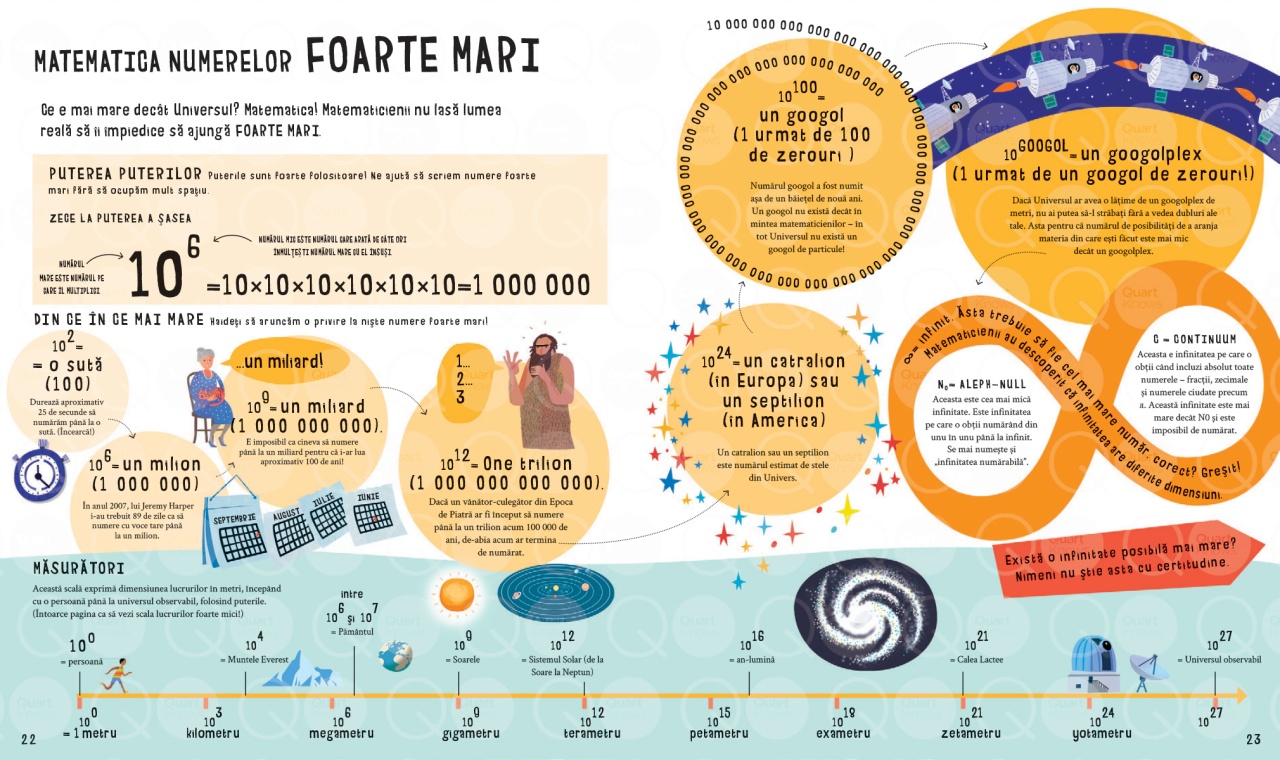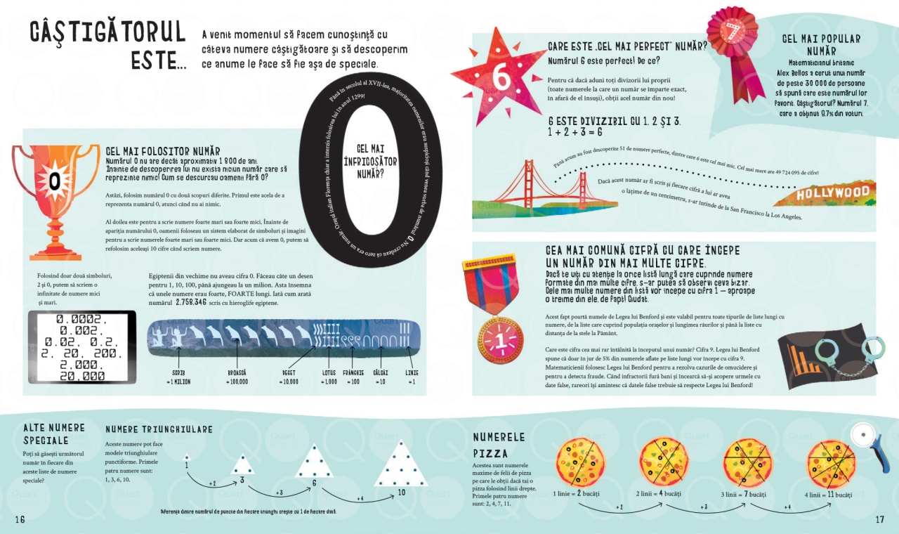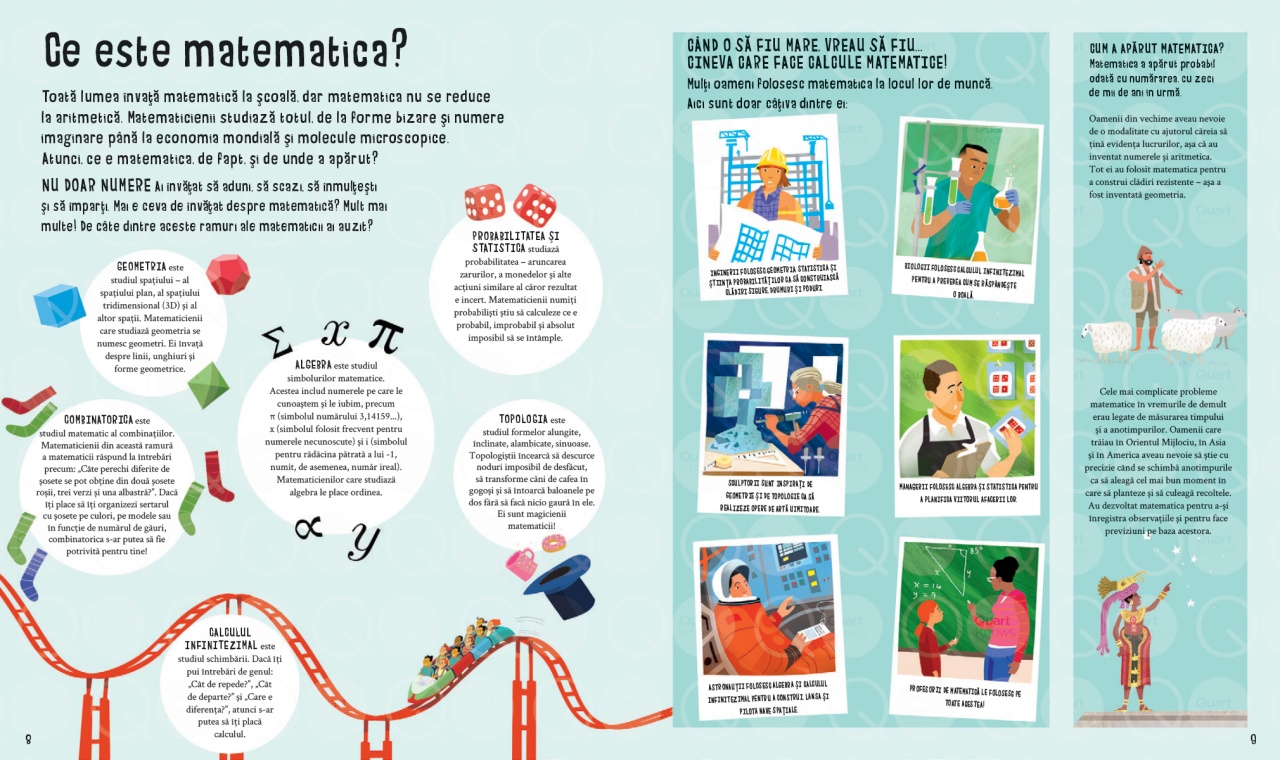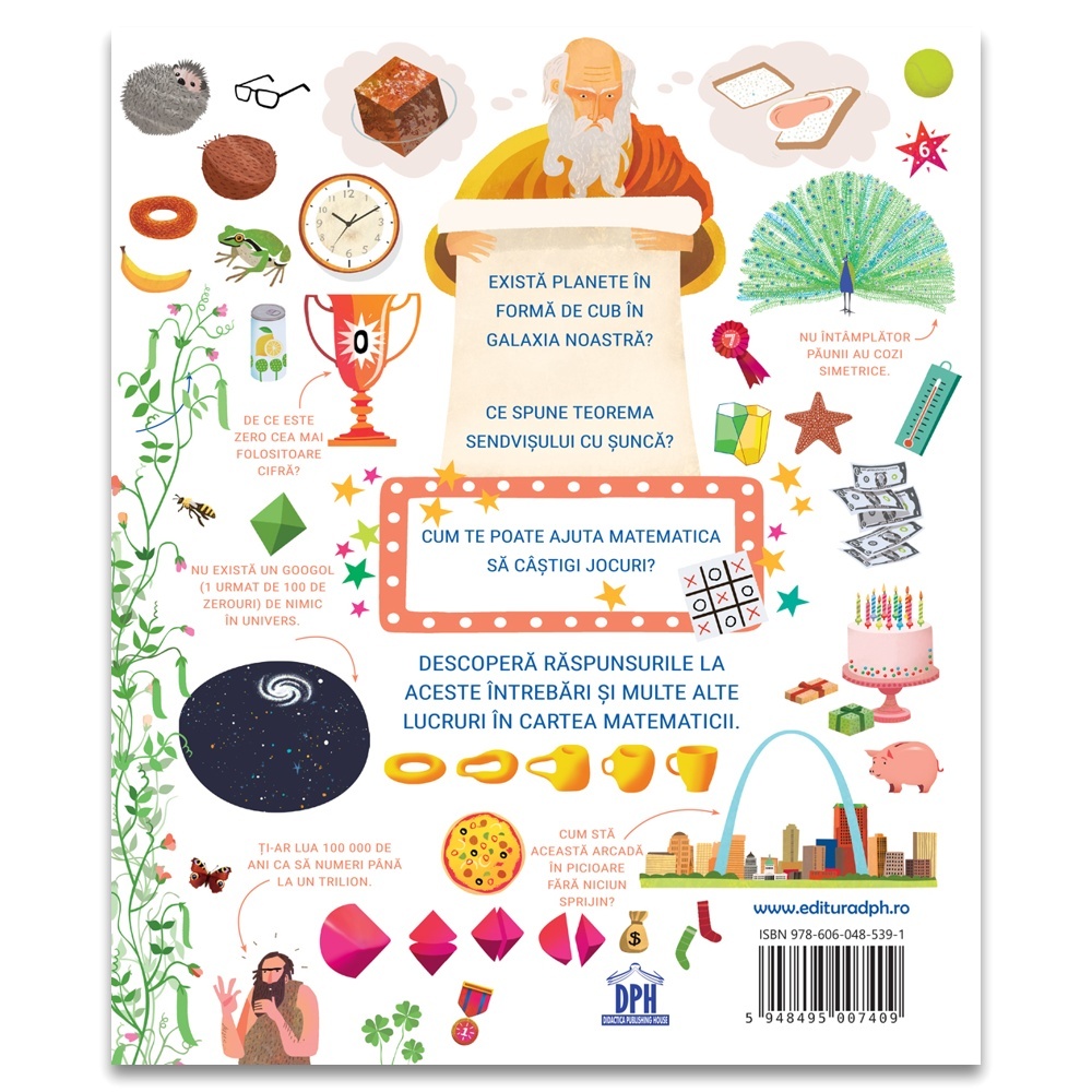 Matematica guvernează lumea! Matematica este magică și este peste tot în jurul nostru: acasă, la școală, în natură și în artă. Această carte abordează Matematica într-un mod informativ și distractiv. O comoară pentru mințile iscoditoare, Cartea Matematicii explică cum te poate ajuta Matematica să câștigi diferite jocuri și arată cum să descoperi viteza cu care cade o piatră sau cu care o rachetă călătorește în spațiu și multe altele. Orice lucru pe care îl poţi vedea, pipăi sau imagina sigur are un sâmbure de matematică în el. Unde vei întâlni matematica astăzi? - Peste 40 de spread-uri complet ilustrate explorează modul în care matematica stă la baza lumii din jurul nostru - Varietatea de subiecte asigură pentru copii o abordare distractivă a matematicii - Elementele vizuale interesante îi ajută pe cititori să înțeleagă cum se utilizează matematica în viața de zi cu zi Despre autor: Clive Gifford este un jurnalist și un autor premiat a peste 200 de cărți și peste 800 de articole și povești scrise pentru adulți și copii. Clive este un autor neobișnuit căruia îi place să lucreze atât în ficțiune, cât și în non-ficțiune. Poate că asta reflectă viața lui neobișnuită: a călătorit în peste 70 de țări, a fost ținut ostatic în Columbia, a făcut parașutism, a practicat multe sporturi și a condus o companie de jocuri pe computer. Paul Boston a studiat ilustrația și designul la Universitatea Brighton și este inspirat de cărțile pentru copii din anii ’50, hărți și diagrame antice, gravuri din secolul al XVII-lea, artă gotică și imprimeuri japoneze. Caracteristici: Pagini: 96 Mărimi: 25 x 29.7 Autor: Clive Gifford Copertă: Cartonată