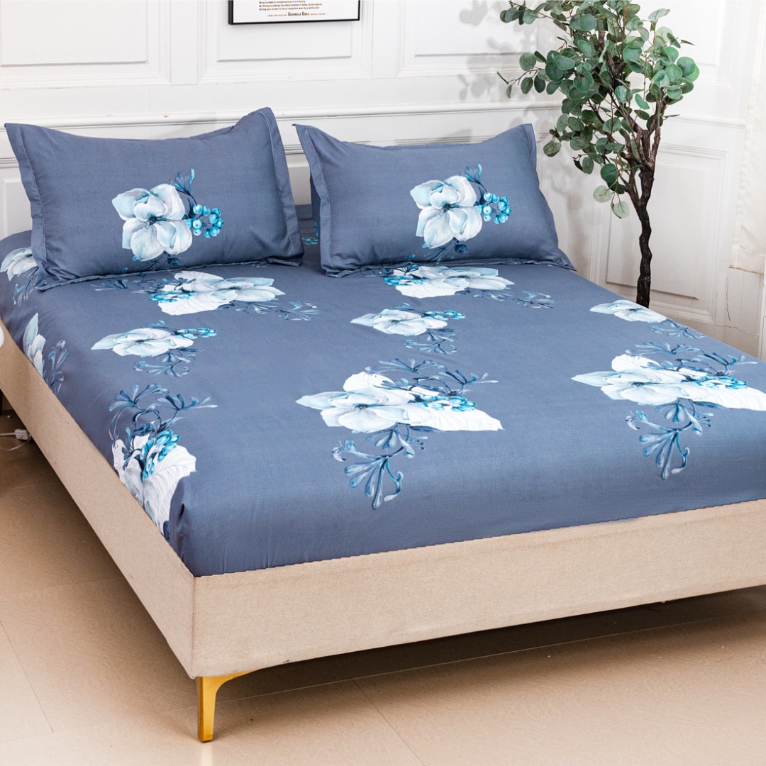 Cearsaf cu Elastic 180x200 cm + 2 Fete de Perna 50x70 cm, Albastru, Flori